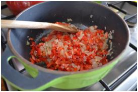 In a heavy bottomed medium saucepan, sauté the onion, garlic, and hot chiles in the olive oil over medium-low heat until the onions are transparent and starting to turn golden, about five to ten minutes. Add the diced red bell pepper, mustard, and cumin and continue to cook for another five minutes.