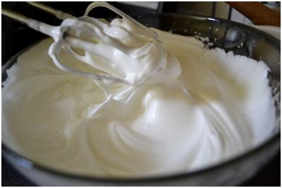 In a separate bowl, making sure your beaters are absolutely clean, whip the egg whites. Once they get to the creamy stage, but not before, gradually add the remaining sugar, and continue beating until whites are stiff and glossy.