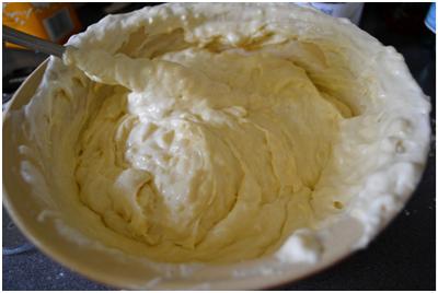 Separate eggs. You’ll need a medium bowl for the yolks and a good sized one for the whites, as five egg whites take on a lot of air. Beat the egg yolks with a hand held mixer until slightly thickened and pale yellow, about four or five minutes. Slowly blend in one and a half cups of the sugar. When the sugar is fully blended add the butter, lemon juice, and vanilla and mix thoroughly.