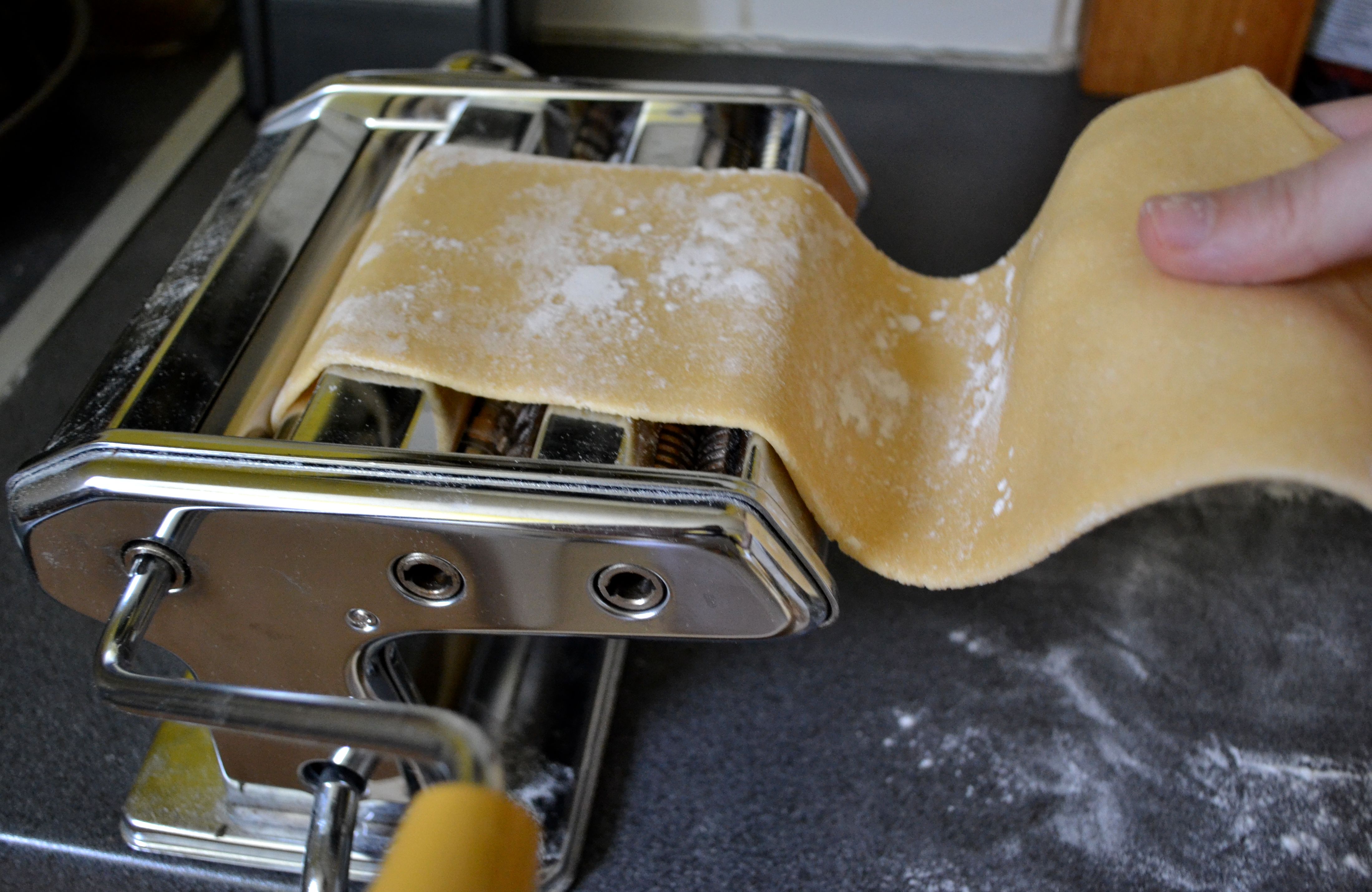 If making linguine or fettucine, once you have gotten your pasta dough to the desired thickness (I go to setting 6 on my pasta machine for fettucine and linguine and setting 7 for lasagne or filled pasta), hang it to dry for about 15-20 minutes, until the pasta is slightly stiff, but before the edges are dry. (I do not dry my pasta when making filled pastas.)