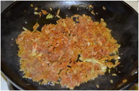Combine the onion, ginger, garlic, 1 teaspoon salt and dry spices, and sauté in two tablespoons olive oil over medium-high heat until the onions are soft and the spices start to release an aroma, about five minutes.