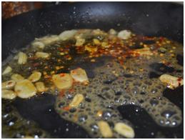 On to the sauce. Melt the butter in a heavy-bottomed frying pan over medium heat. When it is foamy add the garlic and sauté quickly until it is tender, but not brown. Add the red chili flakes and the wine (the butter will sizzle and fizz marvelously), and then stir in the tomatoes.
