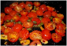 Cook for several minutes, shaking the pan to toss, until the tomatoes have started to turn slightly golden, and their skins have begun to wrinkle and contract. Add the capers and the salt. The tomatoes should immediately release a lot of liquid. Reduce the heat so this doesn’t all steam away. Crank your hot water up to a boil, drop your fresh pasta in – it shouldn’t need more than a couple of minutes to cook – and while it’s boiling stir the squid in with the tomatoes. Cook until the squid is just tender and then remove the pan from the heat. (If you’re anxious about overcooking your pasta, or don’t feel up to expert multi-tasking, you can cook it now instead, while your squid is sitting in the sauce. Your squid shouldn’t turn rubbery if you err on the side of minimal cooking.)
