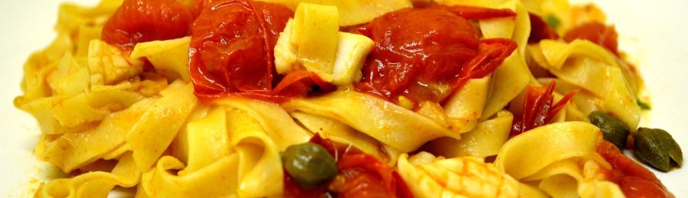 Cook for several minutes, shaking the pan to toss, until the tomatoes have started to turn slightly golden, and their skins have begun to wrinkle and contract. Add the capers and the salt. The tomatoes should immediately release a lot of liquid. Reduce the heat so this doesn’t all steam away. Crank your hot water up to a boil, drop your fresh pasta in – it shouldn’t need more than a couple of minutes to cook – and while it’s boiling stir the squid in with the tomatoes. Cook until the squid is just tender and then remove the pan from the heat. (If you’re anxious about overcooking your pasta, or don’t feel up to expert multi-tasking, you can cook it now instead, while your squid is sitting in the sauce. Your squid shouldn’t turn rubbery if you err on the side of minimal cooking.)
