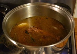 Wash your pheasant well, then quarter it and remove the breast meat from the breastbone, reserving the bones and gizzards. If you are unsure about how to do this, I strongly recommend this video. (It’s for a chicken, but the anatomy is not all that different.)