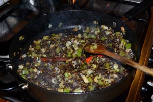 In the same pan, sauté together the leeks, celery, fennel seeds, mustard powder and thyme leaves over medium heat until the leeks and celery have started to soften. Then add the cinnamon stick, red chili pepper, and lentils and sauté for about another minute or two.