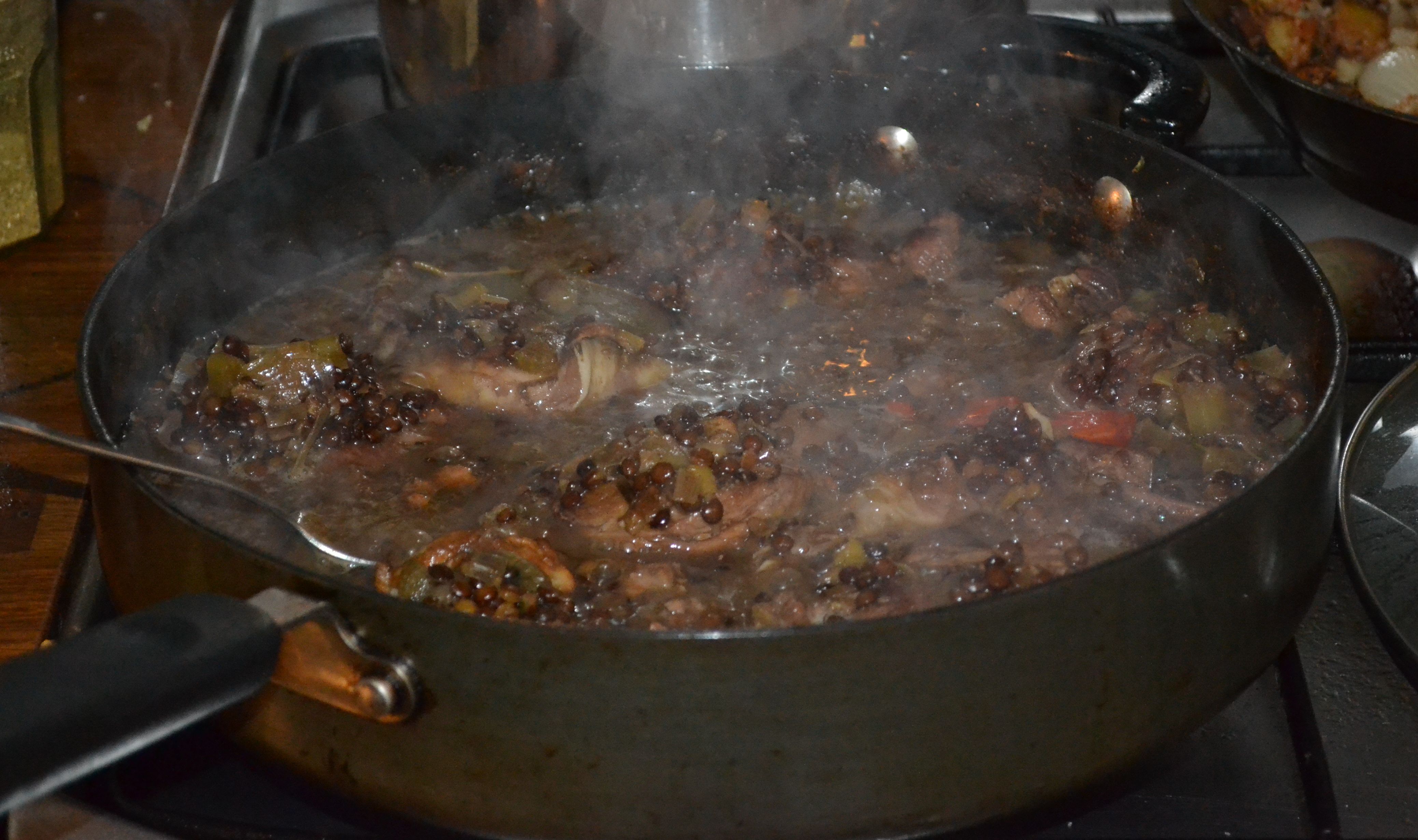 Place the pheasant pieces on top of the lentils and vegetables and add your lovely stock. (It should cover the meat.) Allow it to come to a boil, then reduce to a simmer and cook, partially covered, for about 50 minutes to an hour, or until the lentils are tender. Add additional stock if needed. Alternatively, if, when the lentils are cooked, there is too much liquid, remove the pheasant pieces to a plate and increase heat to reduce the liquid. (If you do this, return the pheasant to the pan for the final resting stage.)