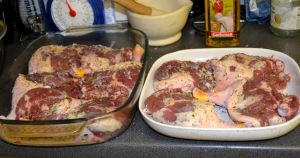 Next, rub the salt mixture lovingly and thoroughly all over the duck legs. Again, you want to use a tablespoonful per leg. Place the legs skin side down in a dish large enough to hold them in a single layer, cover with plastic wrap, and refrigerate for 24 hours.