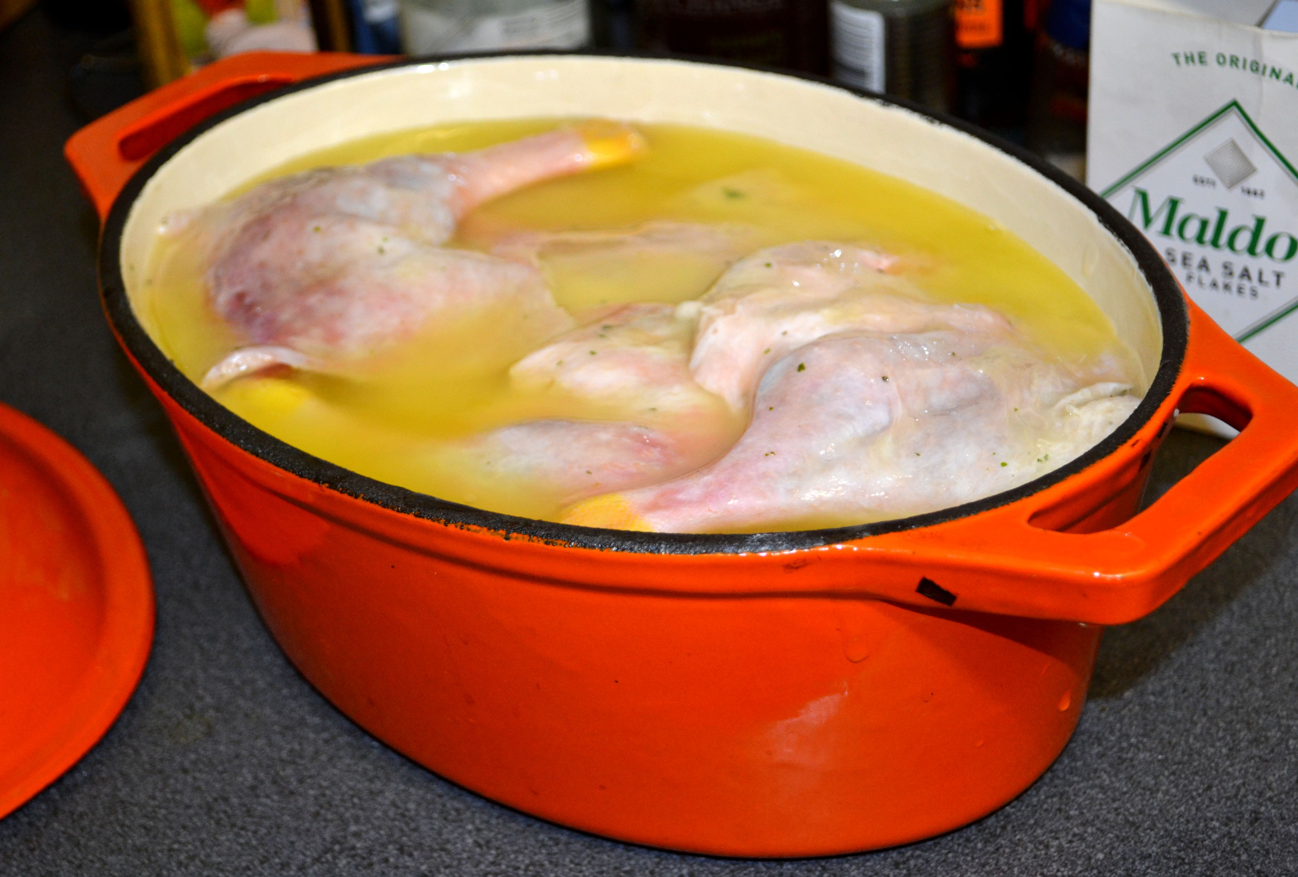 A heavy casserole pot with a tightly fitting lid large enough to hold all of your duck legs snugly – the more snugly you pack them, the less duck fat you’ll need to use