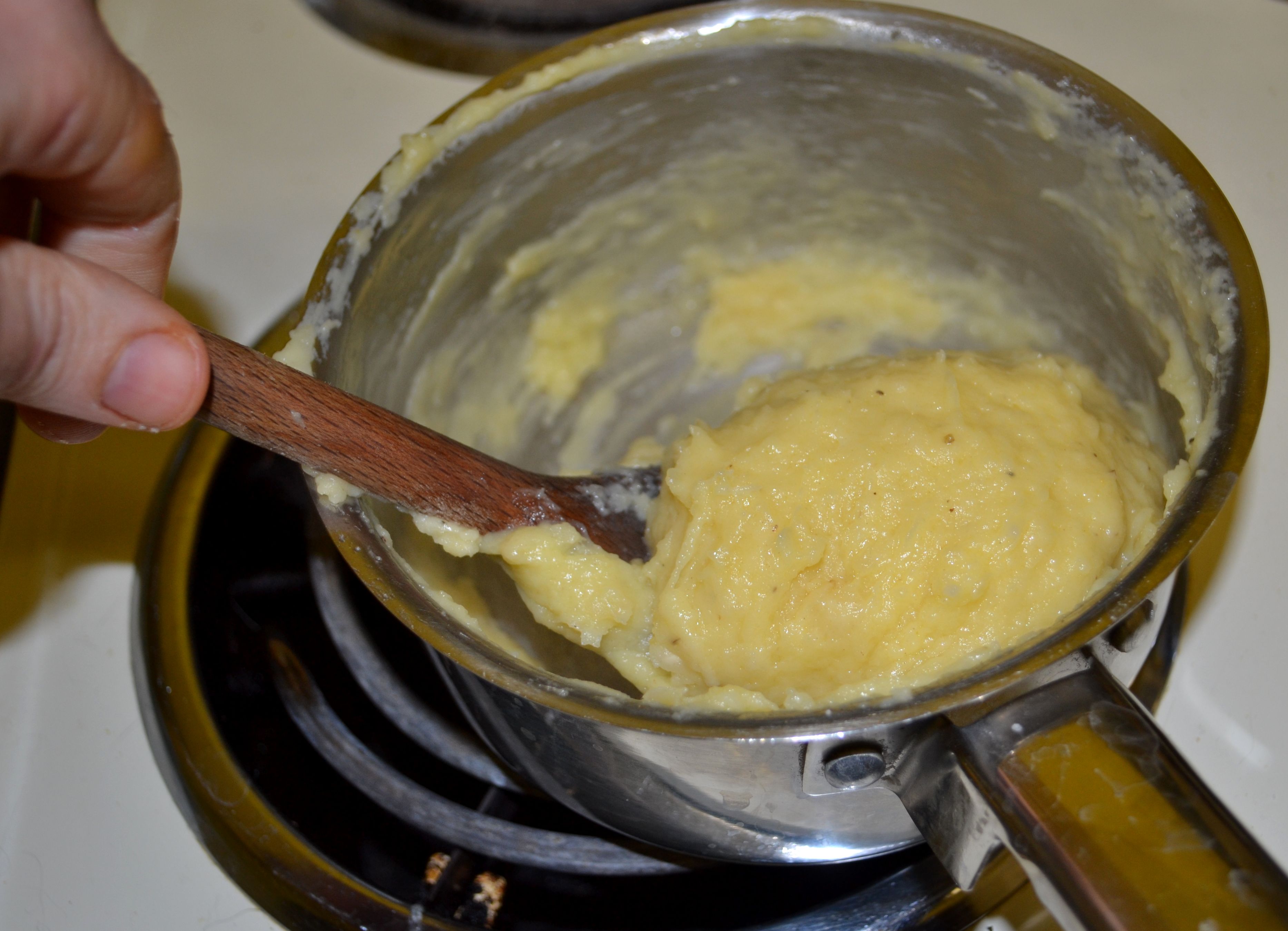 Melt the butter in a saucepan, add the water, milk, salt, pepper, and a bit of grated nutmeg, and bring to a boil. Add the flour all at once and mix vigorously over medium heat to incorporate, stirring from the bottom with a wooden spoon to prevent burning. You should soon have a gooey dough that sticks to the sides and bottom of your pan. Keep mixing – there will be a moment of magic transformation when the dough stops sticking to the pan and becomes shiny and supple and ball-like. Mix for another minute or two, or until the steam rising from the pan starts to smell like baking bread. Don’t worry about the little layer of flour that adheres to the pan.