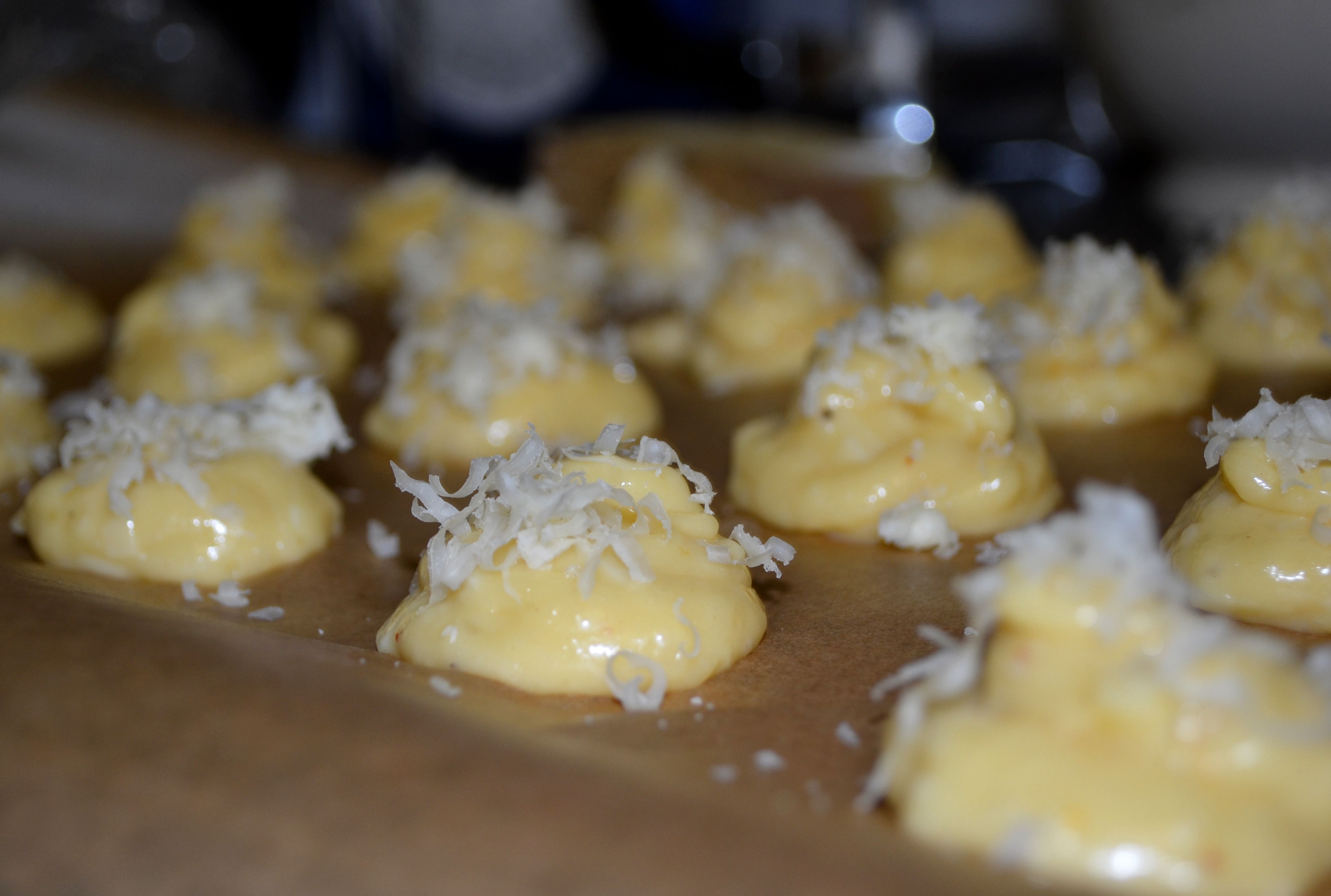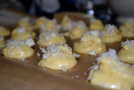 When all the eggs have been incorporated, fold in your grated cheese, and then transfer the dough to a piping bag. Pipe onto the parchment-lined baking sheets into tablespoon-sized mounds (if you don’t have a piping bag, use a spoon for this part). With a wet finger, smooth the points on the puffs and then sprinkle the reserved grated cheese over the top.