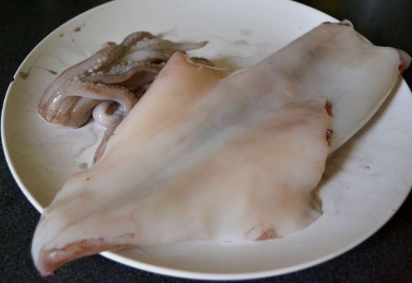Let me first state a qualifier: I’m a self-taught cook, so this is how I’ve TAUGHT MYSELF to clean squid (albeit while following the lead of my parents, who in my lifetime have probably decimated a metric ton of squid purchased from New York City’s Chinatown). Other people may have a different method or additional tips (please comment if you do!). Also, I should say, since the photograph above does not really convey the size of the above squid: it was a GIANT cephalopod. That plate it’s lying on is a dinner plate with a diameter of 11 inches. A right great beastie.