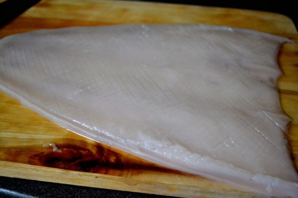 Otherwise, after you’ve cut the squid open, score it by making very fine cuts diagonally and cross-wise across the squid. (Don’t forget to do the same to the fins, which are also edible.) This helps ensure your squid will be tender, not tough. (Sauce gets collected in the cuts too – an added bonus.)