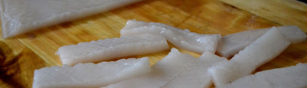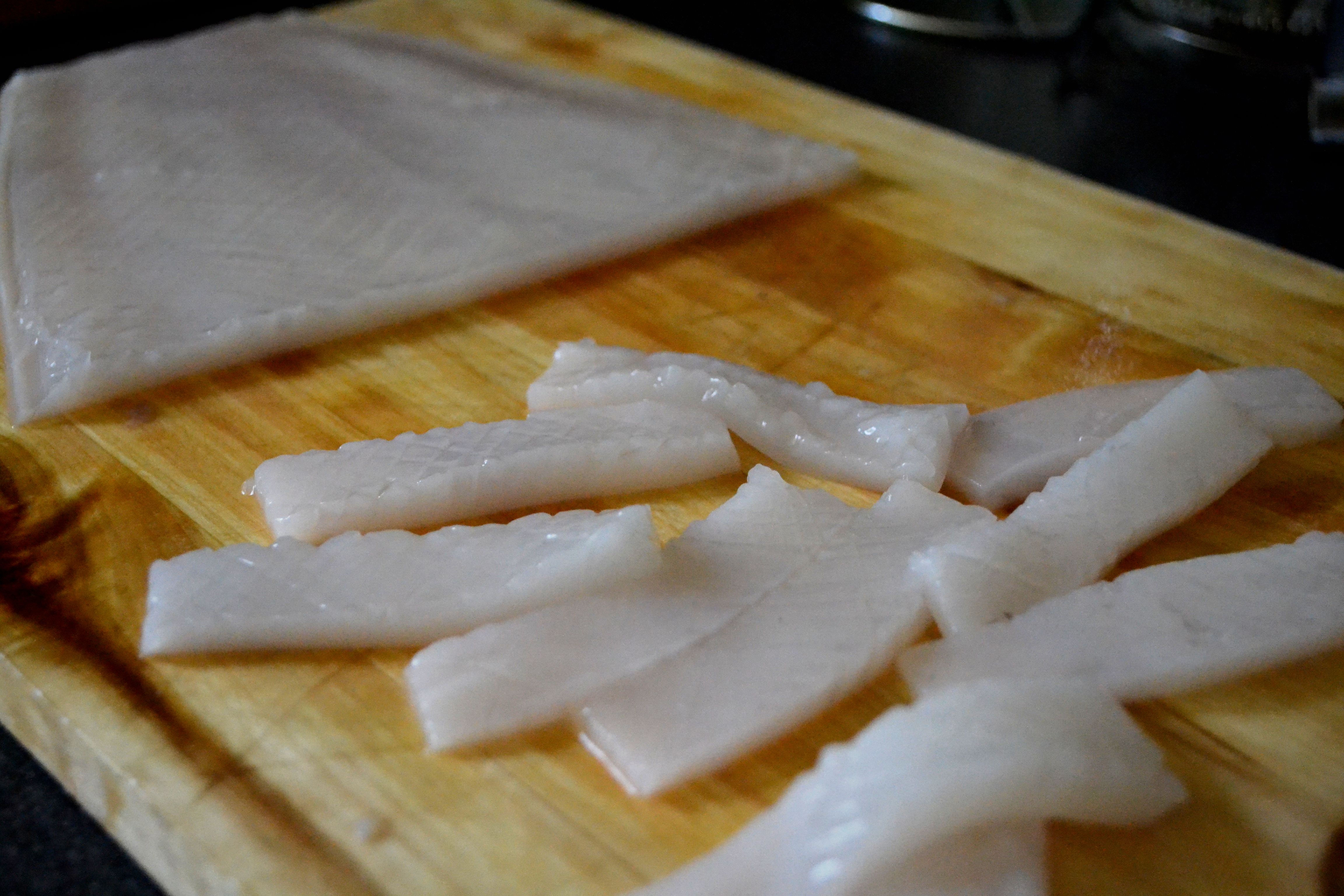Last, cut the squid into strips of your desired length and width, which will curl when cooked.
