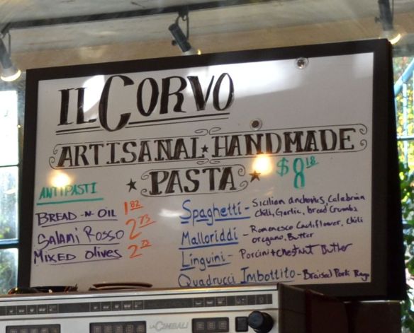 I liked everything about Il Corvo before I ever ate there. The story: a fastidious craft-oriented pasta geek leaves his slick exec chef position at a trendy restaurant to set up what is, essentially, a pop-up in a gelateria. The concept: a few dishes prepared fresh daily by hand, using lovingly-accumulated antique collectible pasta-making equipment, priced within easy reach of budget-constrained diners like me. The principles: Il Corvo’s only open for lunch, Monday through Friday, so that chef Mike Easton can spend time with his family. This singleness of purpose bespeaks a degree of confidence that makes Il Corvo very appealing. If you’re only offering a few dishes and you’re not serving dinner, every plate had better be good enough to make people want to come back. And they do.