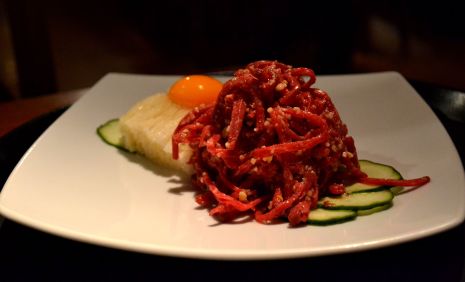 I’ve been to Asadal probably three or four times, always with friend R, who works round the corner. R always orders the same thing: Yuk Hwae (£9.90): raw beef sliced into tidy slender oblongs, served with a raw egg yolk, sesame oil, and lightly sugared shredded pear. The beef is a little fatty and icy cold, and melts against the slight crunch of the sugar crystals on the pear. I like this dish, but my palate’s accustomed to western and Japanese tartares and carpaccios, so I find it a little too sweet and lacking in acid.