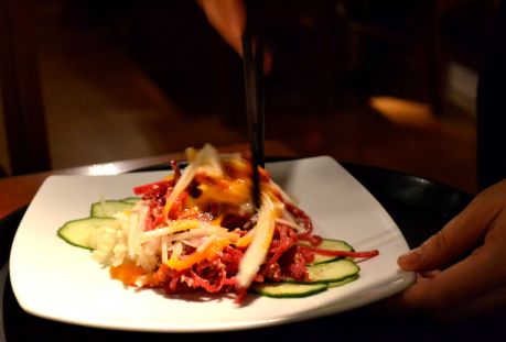 Located at the of bottom steep stairs directly beside the Holborn tube station, Asadal is utterly devoid of natural light. The dropped ceilings, blocky design, and dark wood accents make it feel like a business class lounge at an airport circa 1981. And the service is just this side of too solicitous. Everything is mixed, tossed, grilled, and plated for you; one gets the sense that the servers are barely restraining themselves from hand-feeding you.