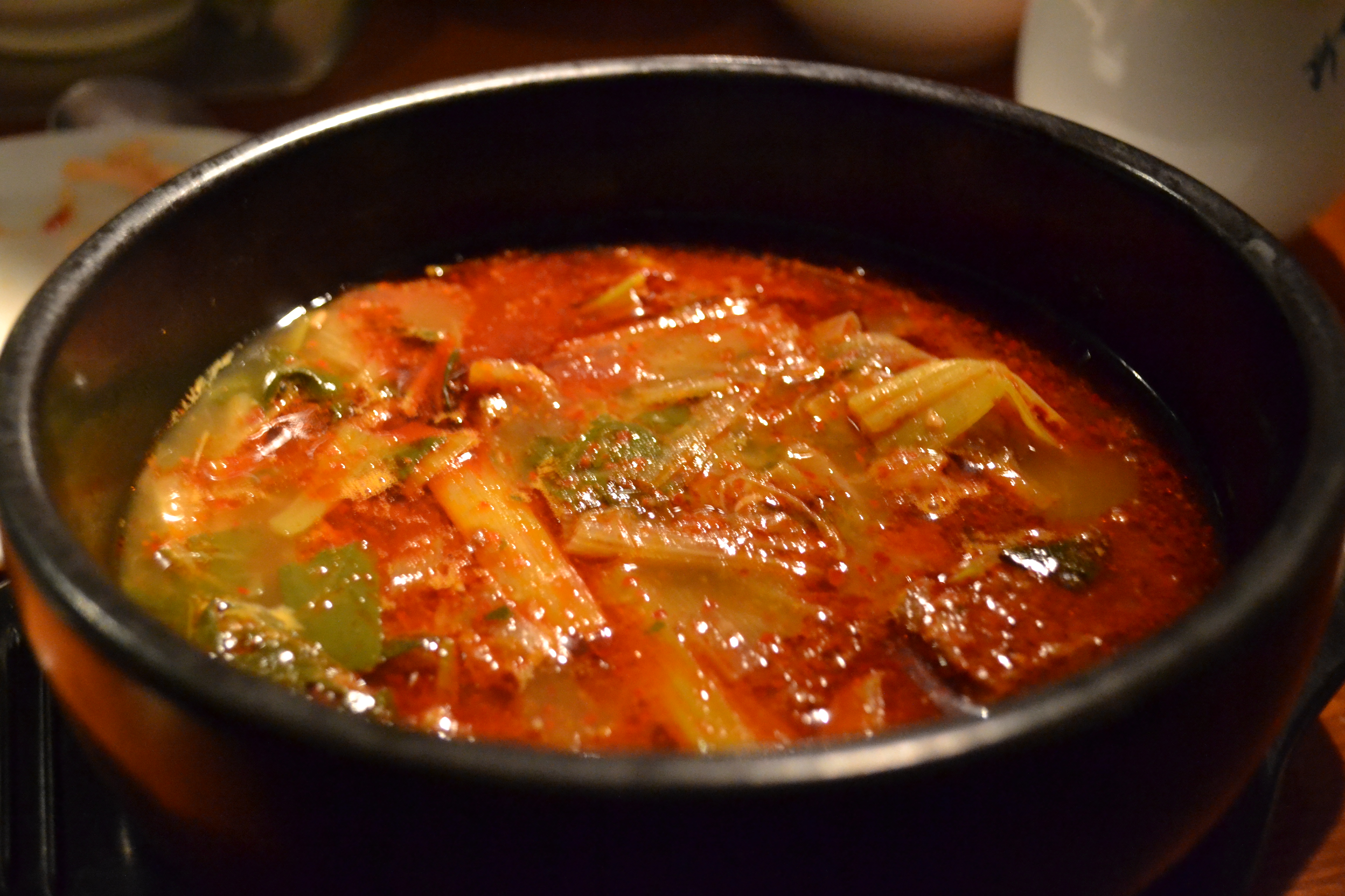 Served bubbling hot, a generous layer of head-clearing chili and oil lies atop a clear beefy broth rich with chunks of toothsome, tender short rib and plenty of kimchee. By the end of it I was high on chilis and my nose, for the first time that day, was blessedly clear.