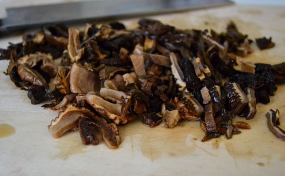 Soak the dried porcini mushrooms in the boiling water for about an hour, or until soft. Strain out and reserve the liquid, and chop the porcini mushrooms into smallish chunks.