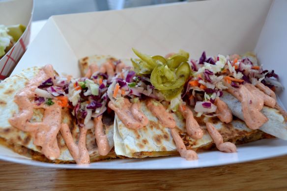 I was less enthusiastic about the kalua pork slider ($2.25 apiece). It was too bready, and the soft marinated pork shoulder was overpowered by the sweet-tangy nunya sauce. The kalua kimchi quesadilla ($5.50), however, made a strong case for Hawaiian-Korean-Mexican fusion. You wouldn’t necessarily think that a flour tortilla stuffed with pork, kimchi, and cheese, topped with a “Korean-style crema”, crunchy slaw and more of the pickled jalapenos would work. Or at least I didn’t. Somehow, though, the whole untidy gooey tangy spicy caloric affair came together to create the perfect stoner food.