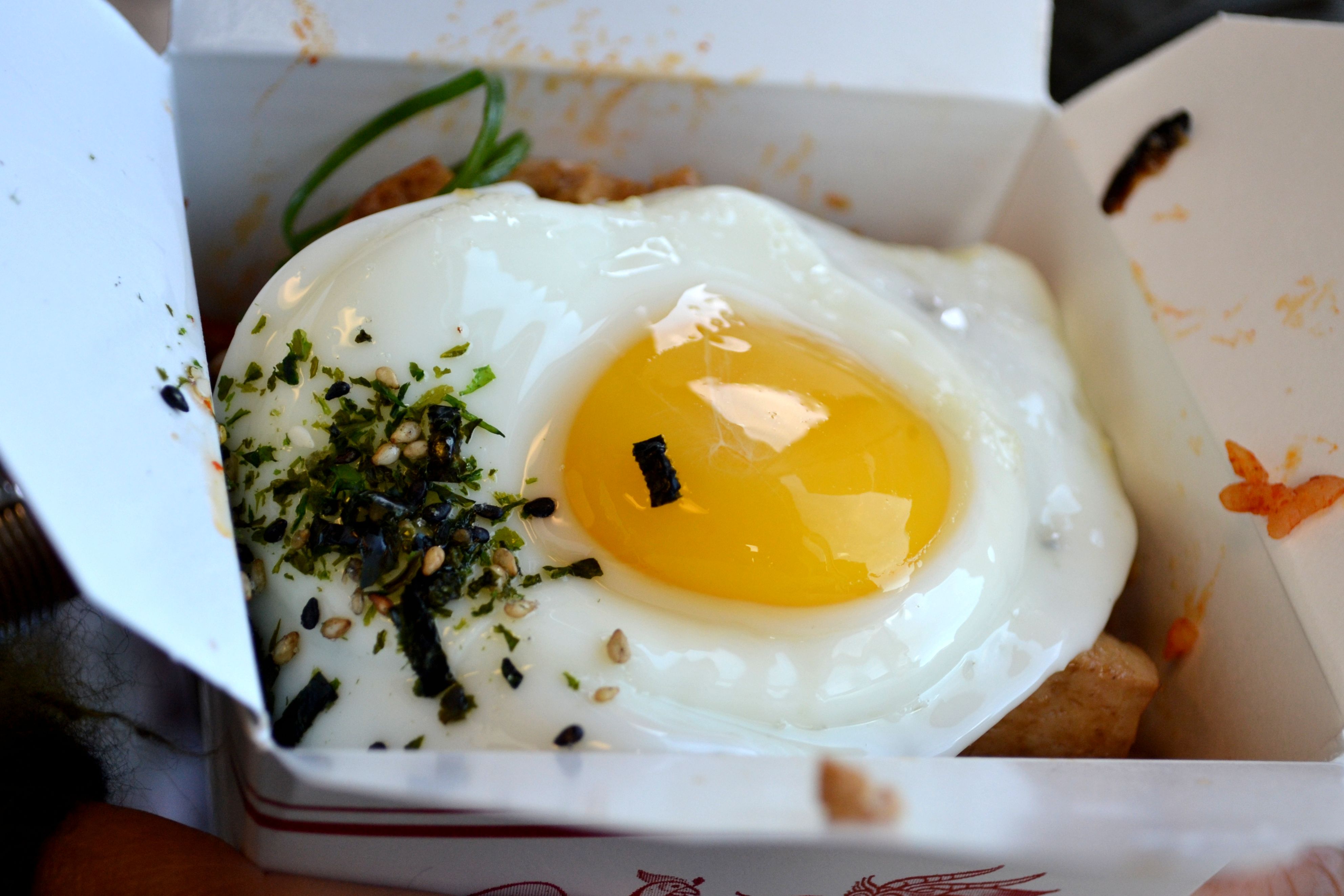 So the first thing I learned about Marination is that it’s not just Korean-Mexican fusion; it’s more sort of Hawaiian-Korean with a bit of Mexican thrown in. The second thing, to my shame, is that I was less enamored of the fusion-y dishes and more into the dishes that evoked straight up Korean. Ergo: I was a HUGE fan of the kimchi fried rice ($5.50). (Friend S doesn’t eat meat so we had it with “sexy tofu,” but you can order it with spicy pork, kalbi beef, or ginger chicken.) The rice was properly spicy and strongly tangy (they’re not shy with the kimchi, bless them), it had just enough delicate crunch of toasted sesame and furikake, and then there was the marvelous unctuousness of the egg yolk spreading through and lubricating everything.