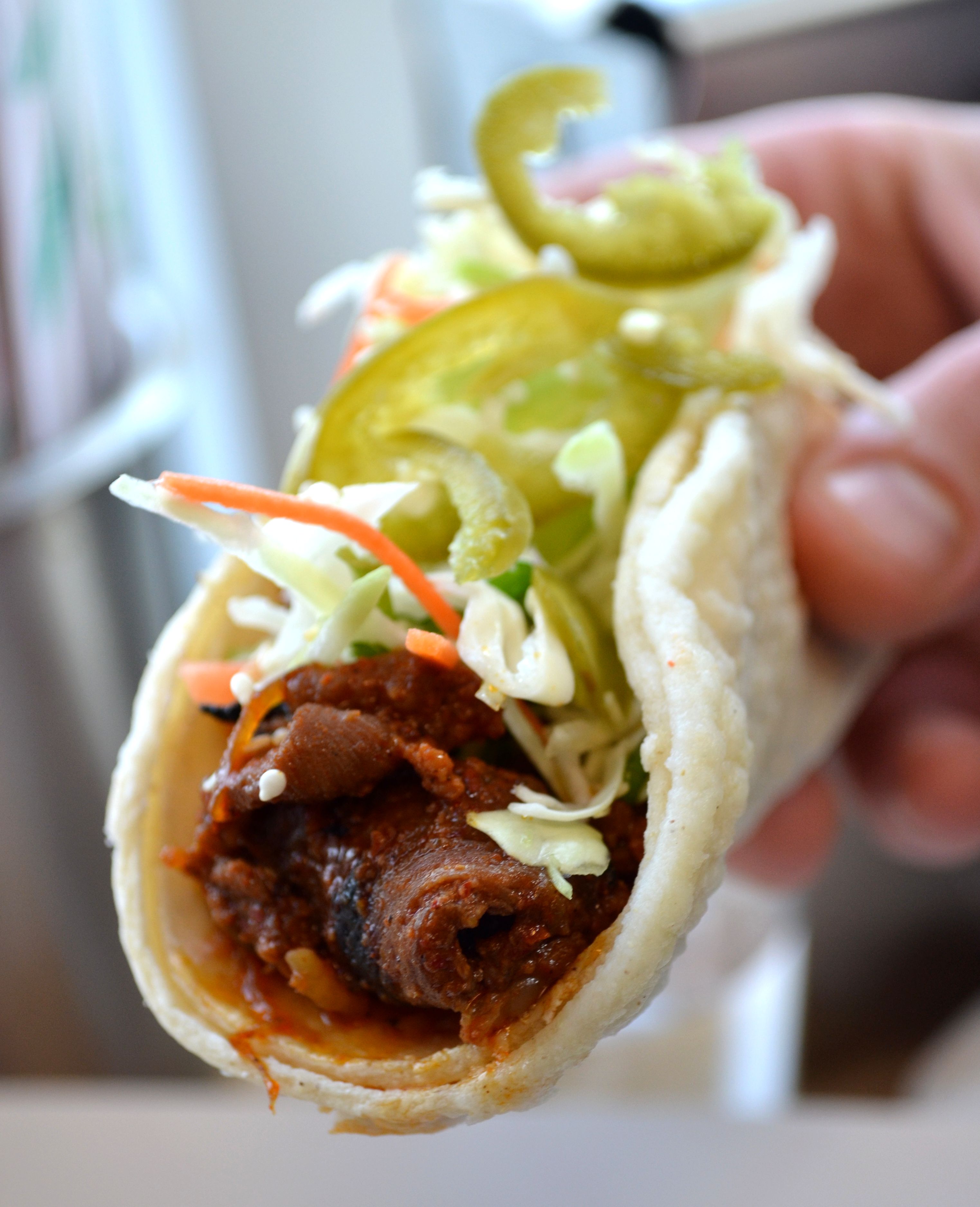 I also liked the overstuffed, messy kalbi beef tacos ($2.25 each), made with salty sweet caramelized fatty short ribs, crunchy cabbage slaw and plenty of delicious pickled jalapenos.