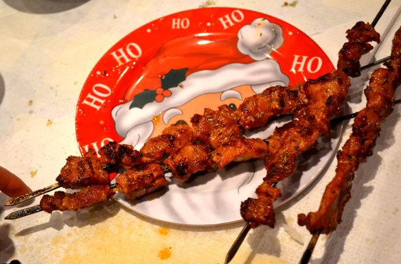 The grilled lamb skewers are a bargain at £1 apiece, crispy, sticky, slightly charred, and chewy sweet, the meat dusted with cumin and served, amazingly, on SANTA PLATES. (After studying our laconic server’s face for a glint of humour I decided this was done wholly without irony.)