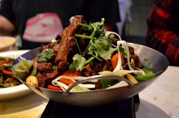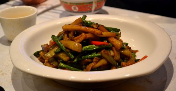 At £15, the Spicy Duck with Beer in Hot Pot was one of the more expensive dishes on the menu (in the “Chef’s Special’s section) but seriously – with a name like that, how could we not order it? The duck had been braised and was caramelized such a rich brown that I would have guessed it was meat or game. Served over a gas burner, with plenty of fresh coriander and a few vegetables, it was swimming in a dark, complicated, anise-scented sauce, tingly with Szechuan peppercorn, with a generous layer of spicy chili oil on top. The longer it bubbled away, the spicier and gamier the duck became.