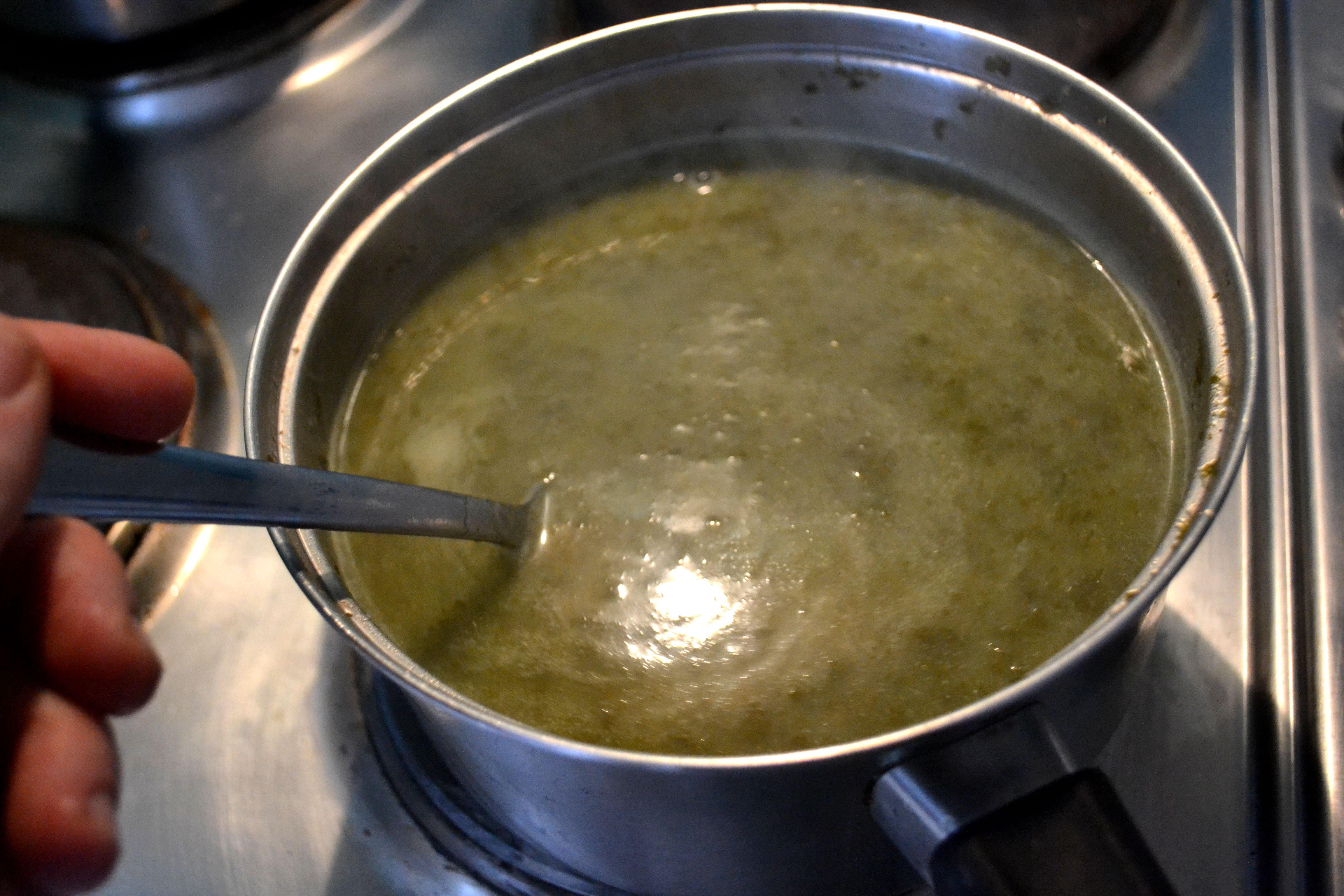 Cook the potatoes in the remaining stock until very soft. Puree with an immersion blender until completely smooth. Stir in the sorrel broth and over medium heat again bring the soup to a gentle boil. Taste and adjust seasonings, adding a few grinds of black pepper.