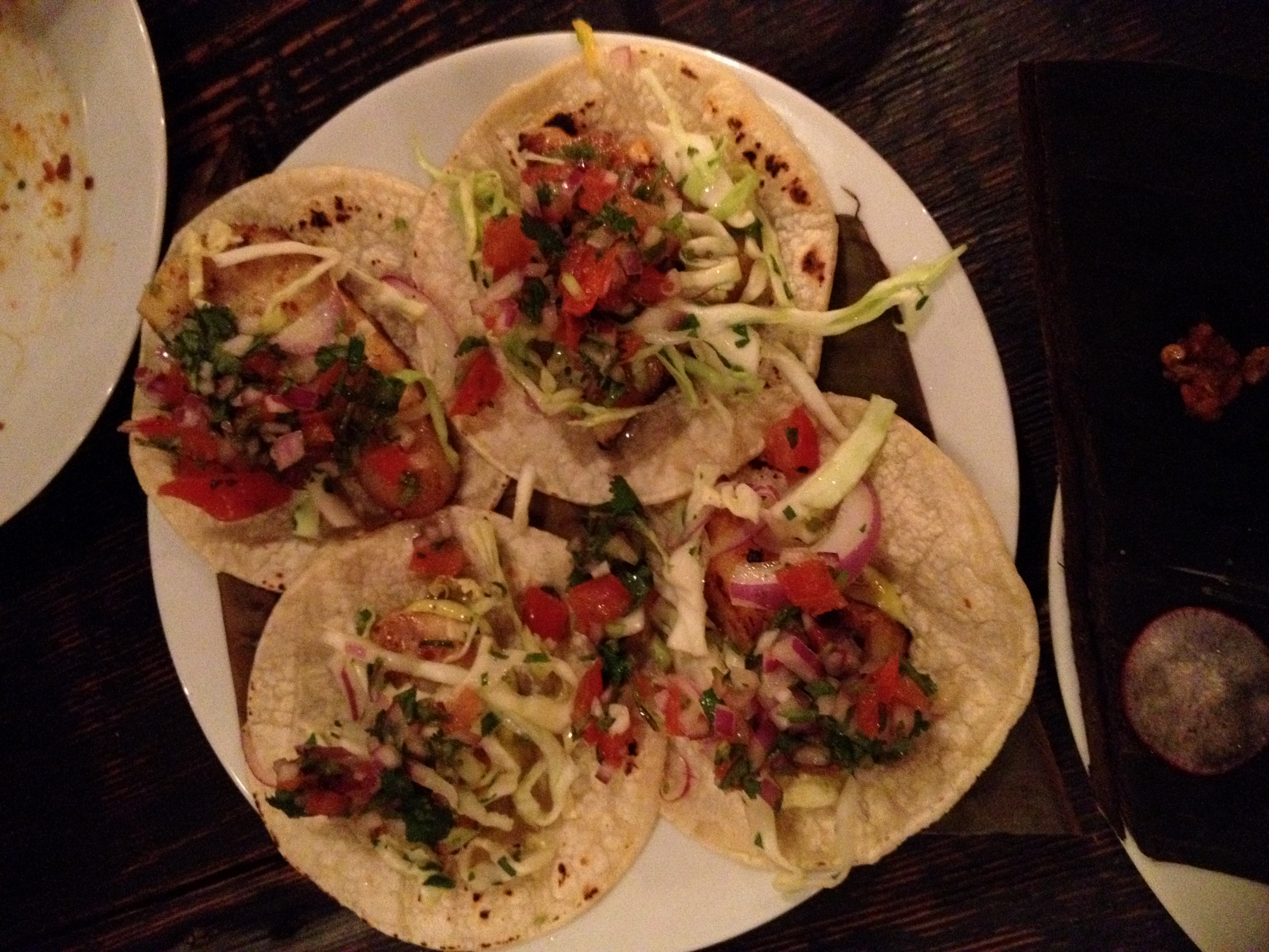 We were all famished, so after a bracing round of tequila shots we ordered queso fundido (spiced melted cheese with poblano chiles served with toasted tortillas and pico de gallo, $8) and every taco on the menu. (My apologies: most of my photos are terrible, so you’ll just have to trust me that these plates were gorgeous.) With our first taco, I realized that the meal was going to be stellar. Cochinita pibil is Yucatecan-style suckling pig, traditionally buried in a pit and slow-cooked. I ate it whenever I could in the Yucatan – and some places did it better than others. This was extraordinarily good – rich and tender, lingeringly sweet, with a tingly hot kick from the habanero. Campechano ($8) – salt-cured beef with chorizo, chicharron and smoked jalapeno – was an immensely complex, exciting dish. Piles of lean cured beef topped with a crumbling of cotija cheese got a fatty boost and smoky heat from the chorizo and smoked jalapeno, with the crispy chicharrons (pork crackling) adding crunch and texture. Both vegetarian tacos – potatoes with poblanos ($7) and nopales ($7, grilled cactus with avocado salso and cotija cheese) showed the same careful attention to flavour, balance, and spicing as the meat tacos, the bright flavours and heat at equipoise (yes, equipoise) with the dense taste of umami.