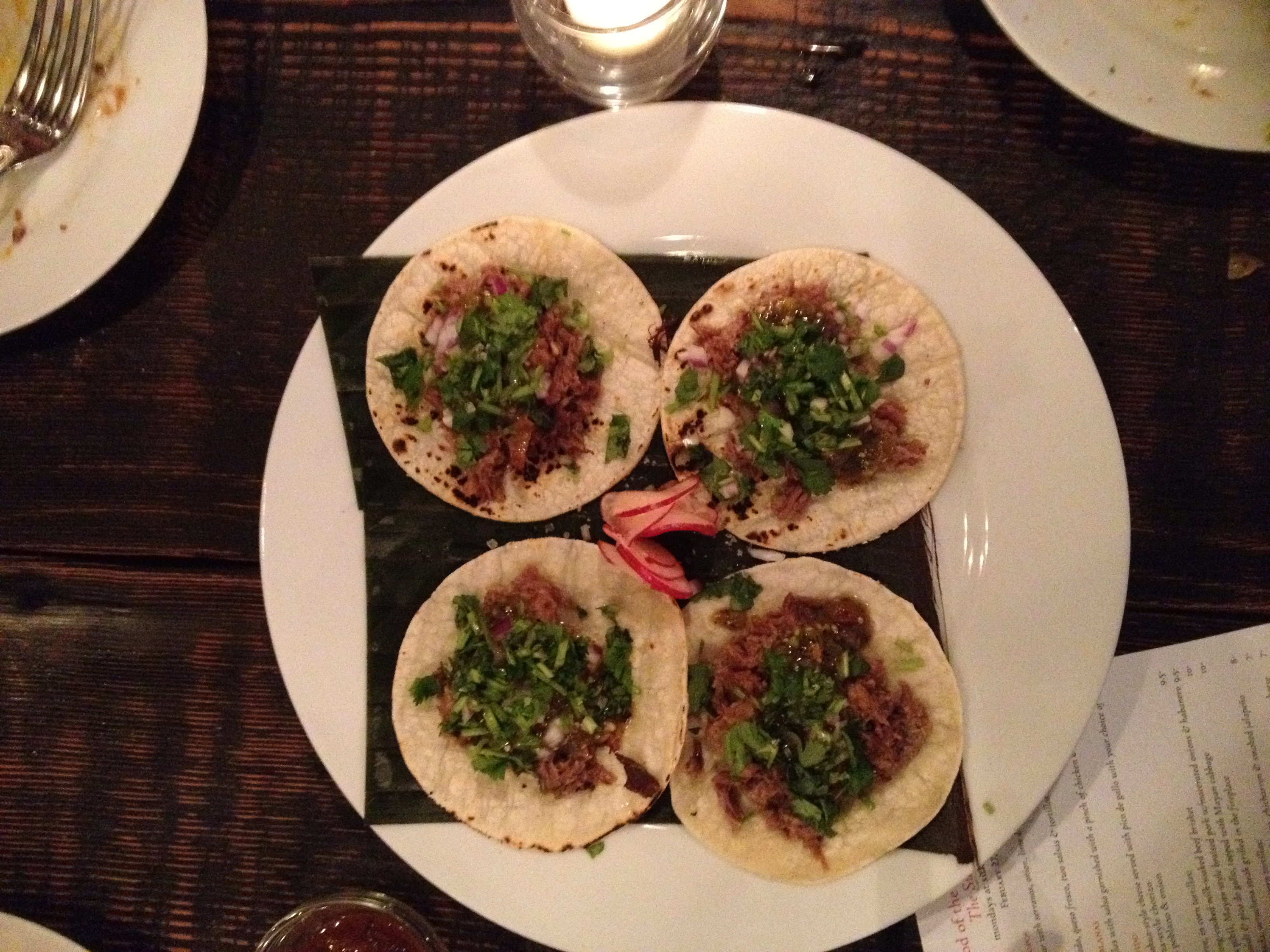 But Taco Monday is not Dillon’s night. In fact, Sitka and Spruce used to be closed Mondays, but one of Dillon’s chefs – from Mexico City, I think – persuaded him to let him run a Mexican pop-up, called The Suadero, “food of the ‘malafacha’” (literally, poorly dressed). More about the suadero later.