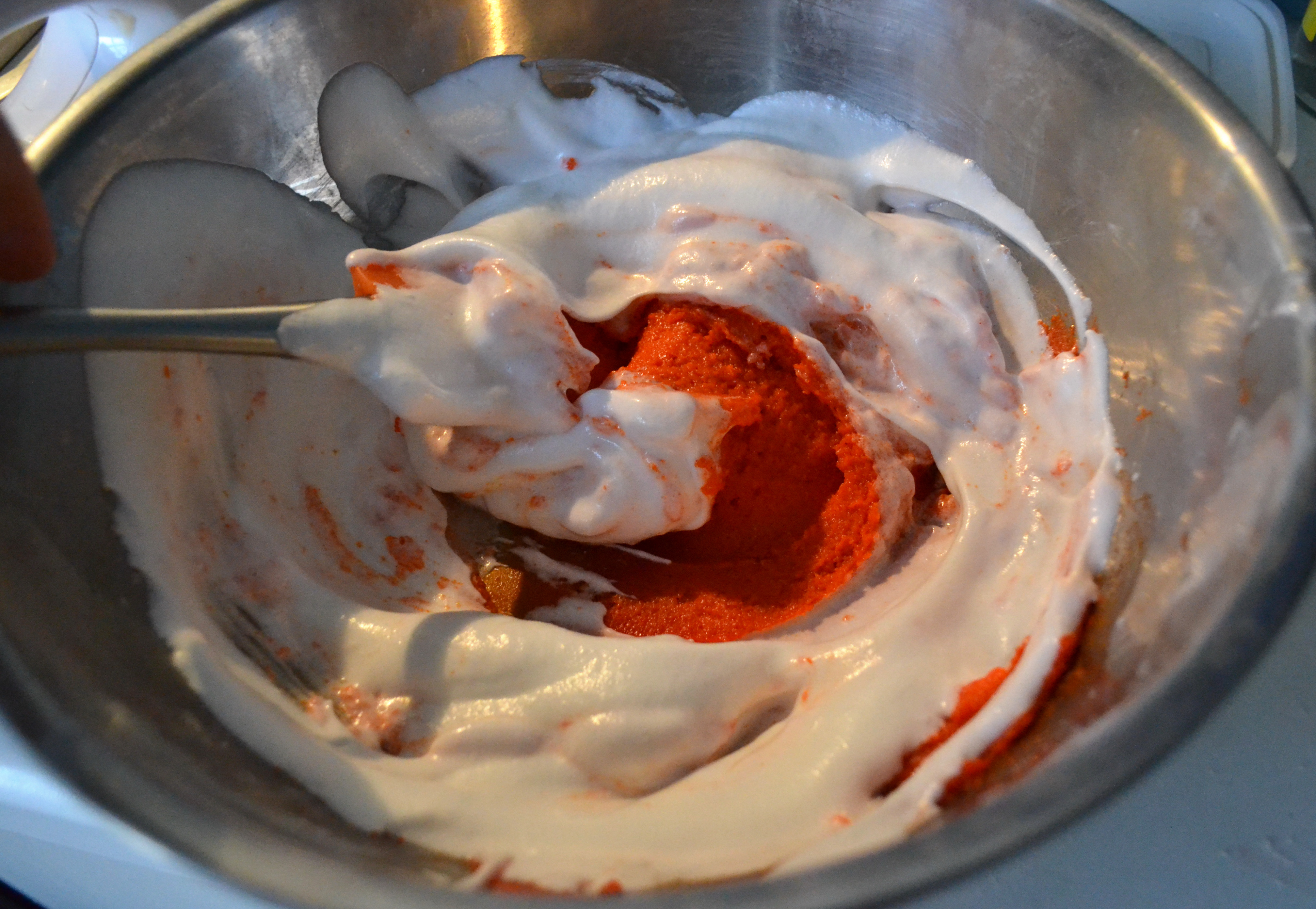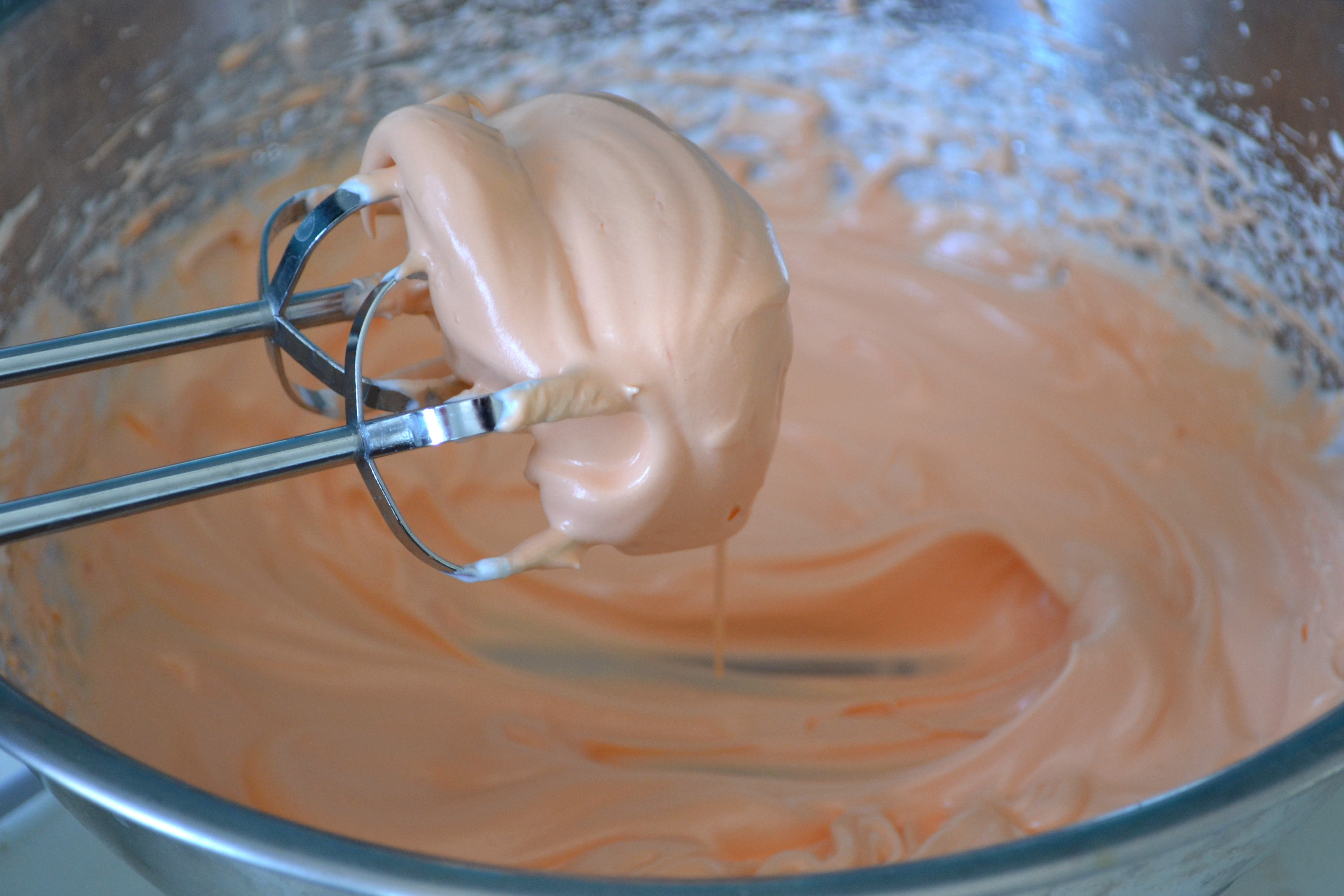 After three more minutes of mixing at high speed, meringue is stiff and dry. I have added but not yet incorporated a tiny amount of food coloring paste.