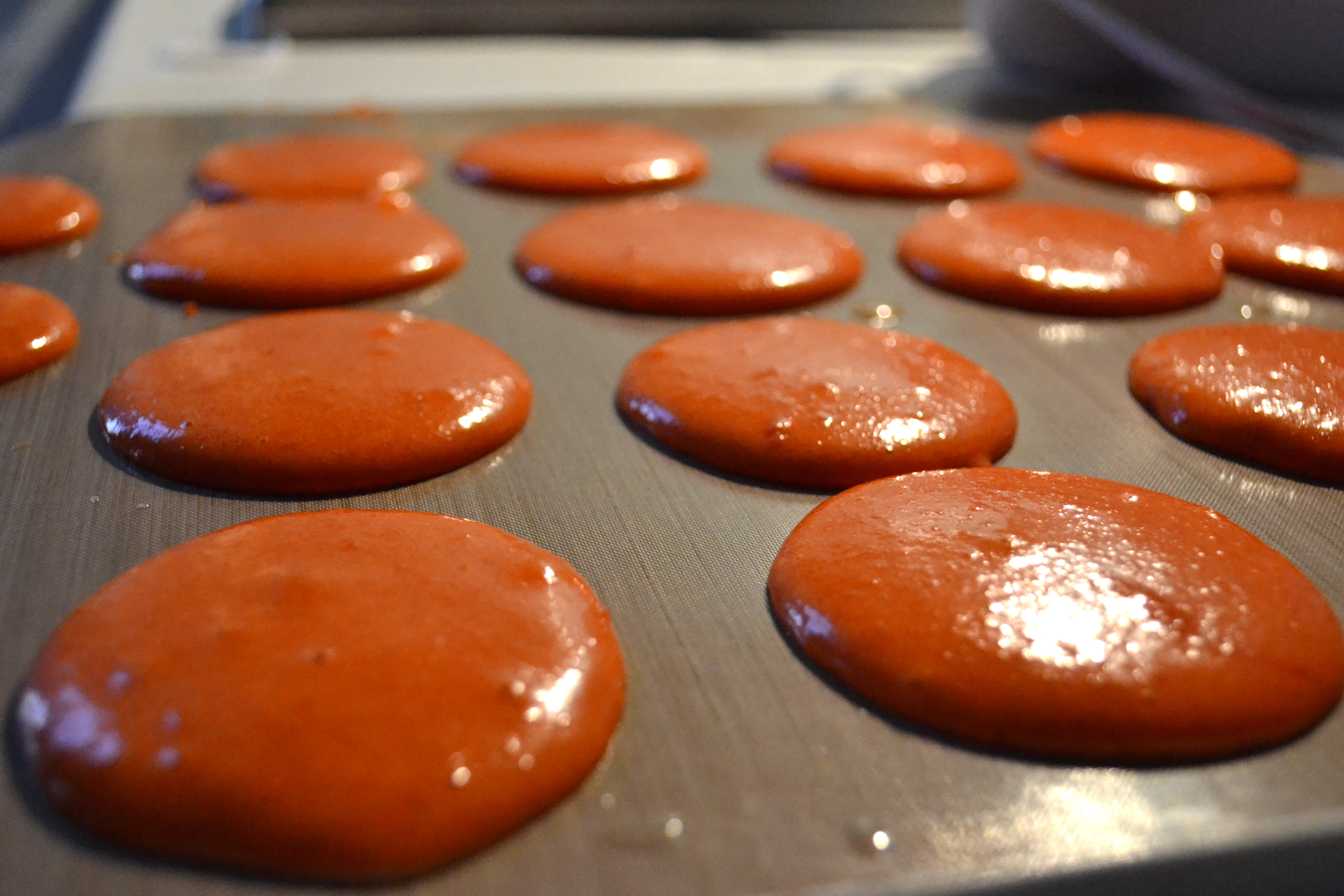 After loads more research I settled on a recipe that had numerous delighted comments from successful home bakers. It called for Italian meringue, meaning that a hot sugar syrup was beat into the egg whites. From lofty hindsight, I think I know what went wrong: I didn’t get my meringue stiff enough before adding the almonds and powdered sugar, and I added way, WAY too much food coloring paste.