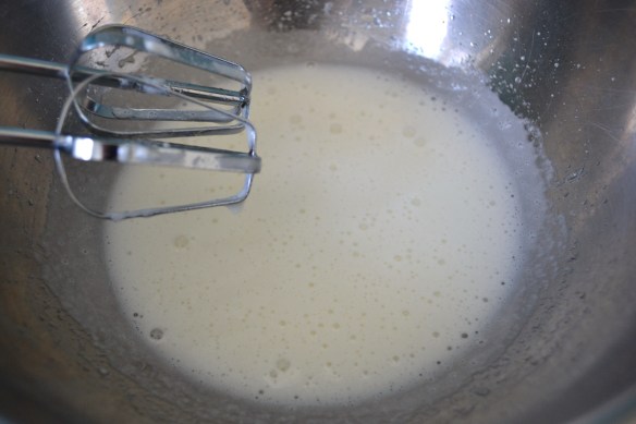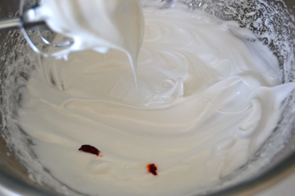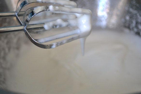 Three additional minutes of mixing, speed increased slightly. Meringue is stiffening but still runny