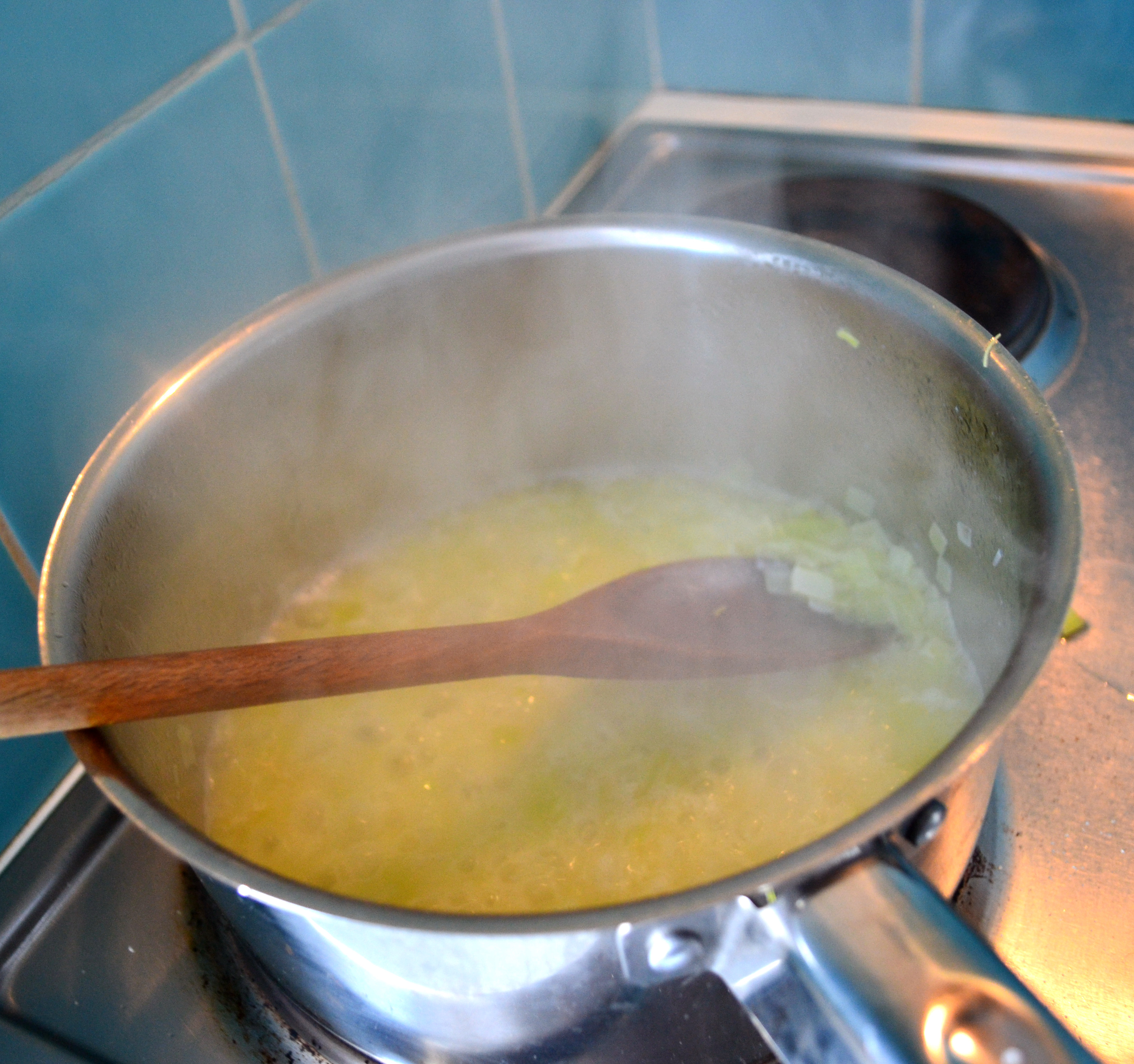To prepare the risotto, start by bringing your stock to a low simmer on your stovetop. You will want to keep the stock hot while you’re cooking the risotto. Next, melt most of the butter for the risotto (leaving aside a knob to add at the end) in a heavy bottomed pot.  Sauté the leeks in the butter over medium-high heat until they are semi-transparent, and then add all the wine.