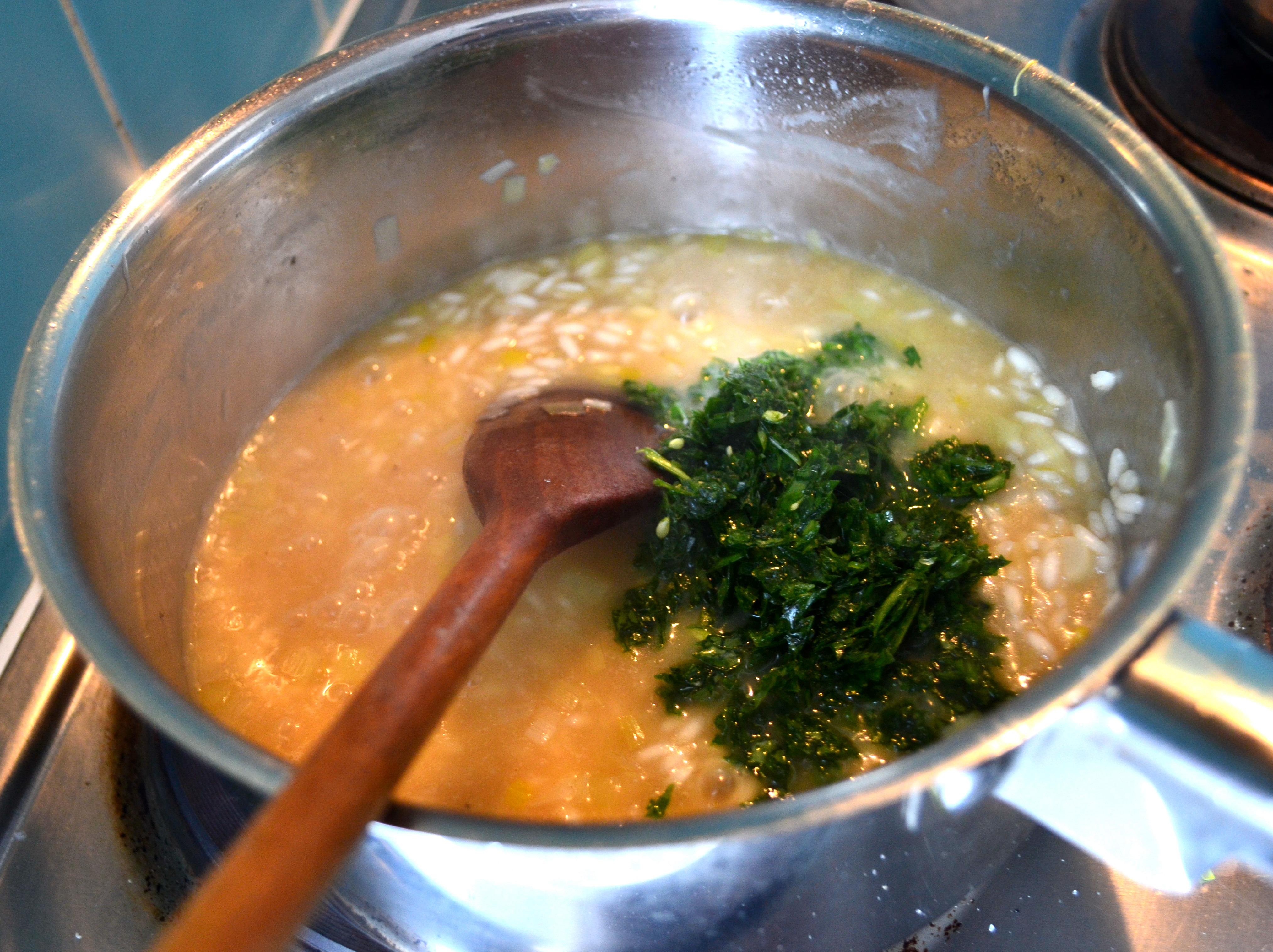 When you’ve added most of your stock, add the wild garlic and stir through, and season with salt and pepper. (One and a half to two teaspoons of salt should be about right.) You can start testing the risotto: you want the rice to be firm and just slightly al dente, with a soft, creamy liquid around it. A good risotto should spread on the plate; it should not be stiff or pasty.