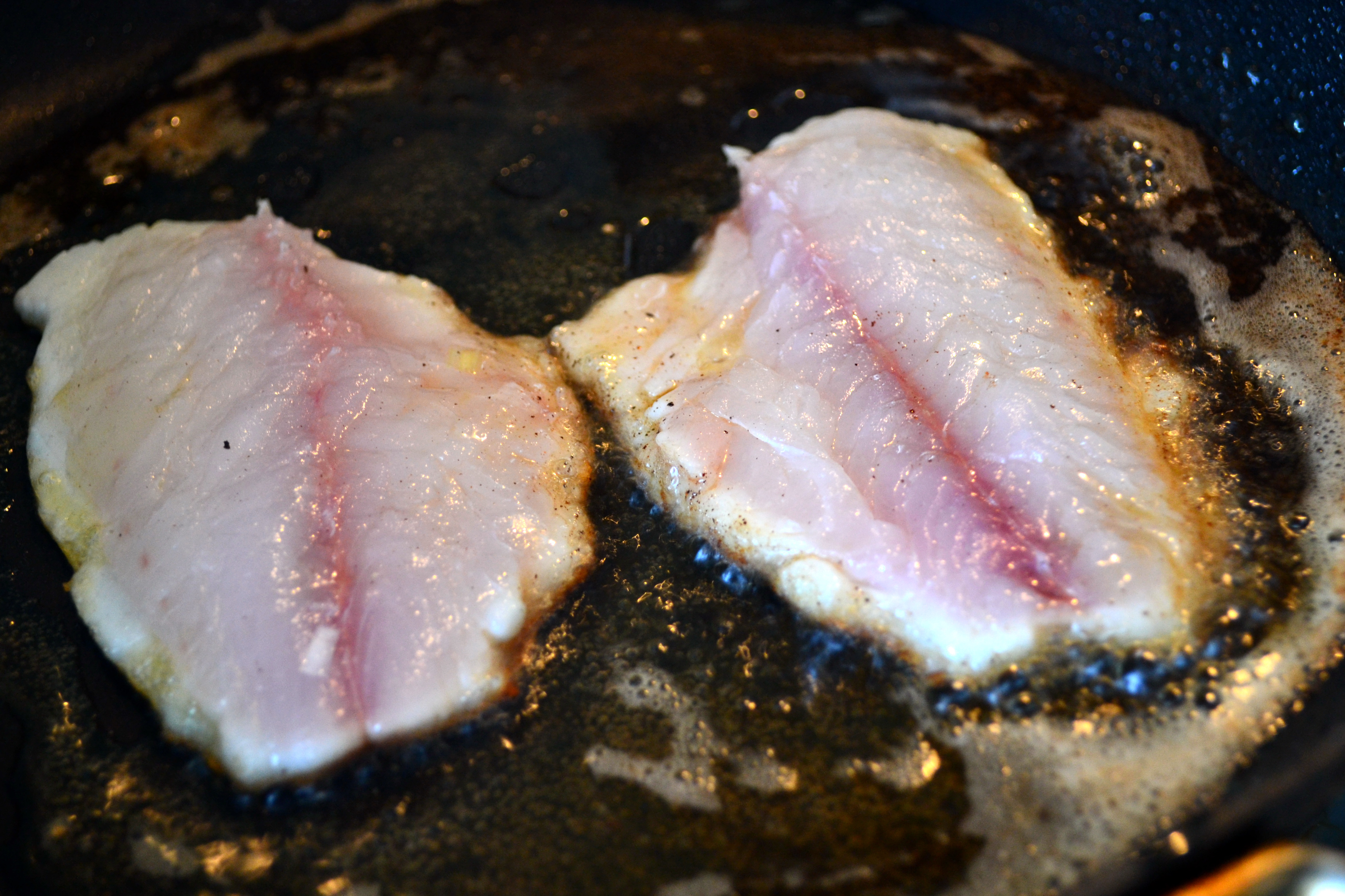 For the fish, heat the remaining butter and olive oil in a heavy bottomed skillet over medium-high heat until the butter has foamed and started to turn golden and the pan feels hot if you hold your hand above it. Fry the fish skin side down, pressing each fillet firmly with a spatula to keep it from curling and to get all the skin to crisp up. When the edges of the fish have turned golden flip the fillets once.