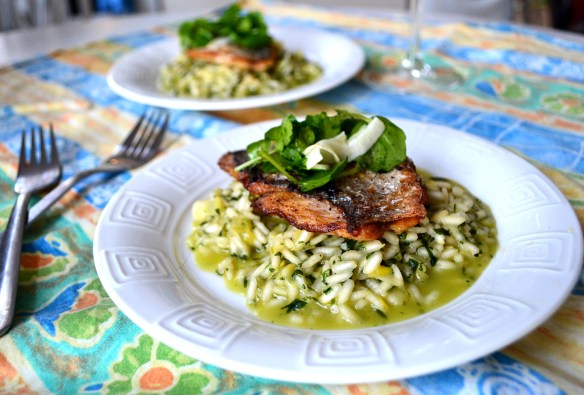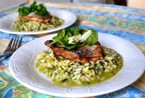 To serve, ladle some risotto into the center of warmed plates, lie a fillet on top skin side up, and top with a bit of the shaved fennel and watercress. Bon appétit!