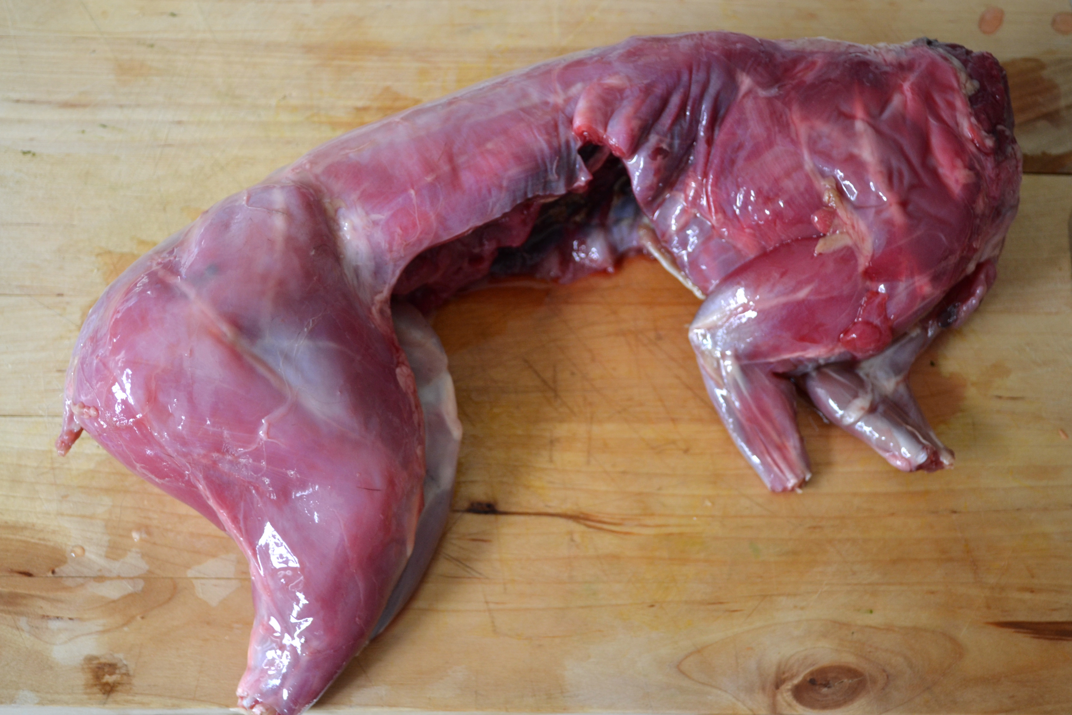 When you are buying a rabbit (if you’re motivated by environmental concerns, do cook wild rabbit – farmed rabbits have almost the same impact on the environment as farmed chickens), look for a rabbit with firm, dark-pink flesh and a sweet smell. Rabbits shouldn’t smell particularly gamey. You probably will start out with something that looks like this (tender-hearted vegetarians, don’t read further; this blog post has bunny carcass photos):