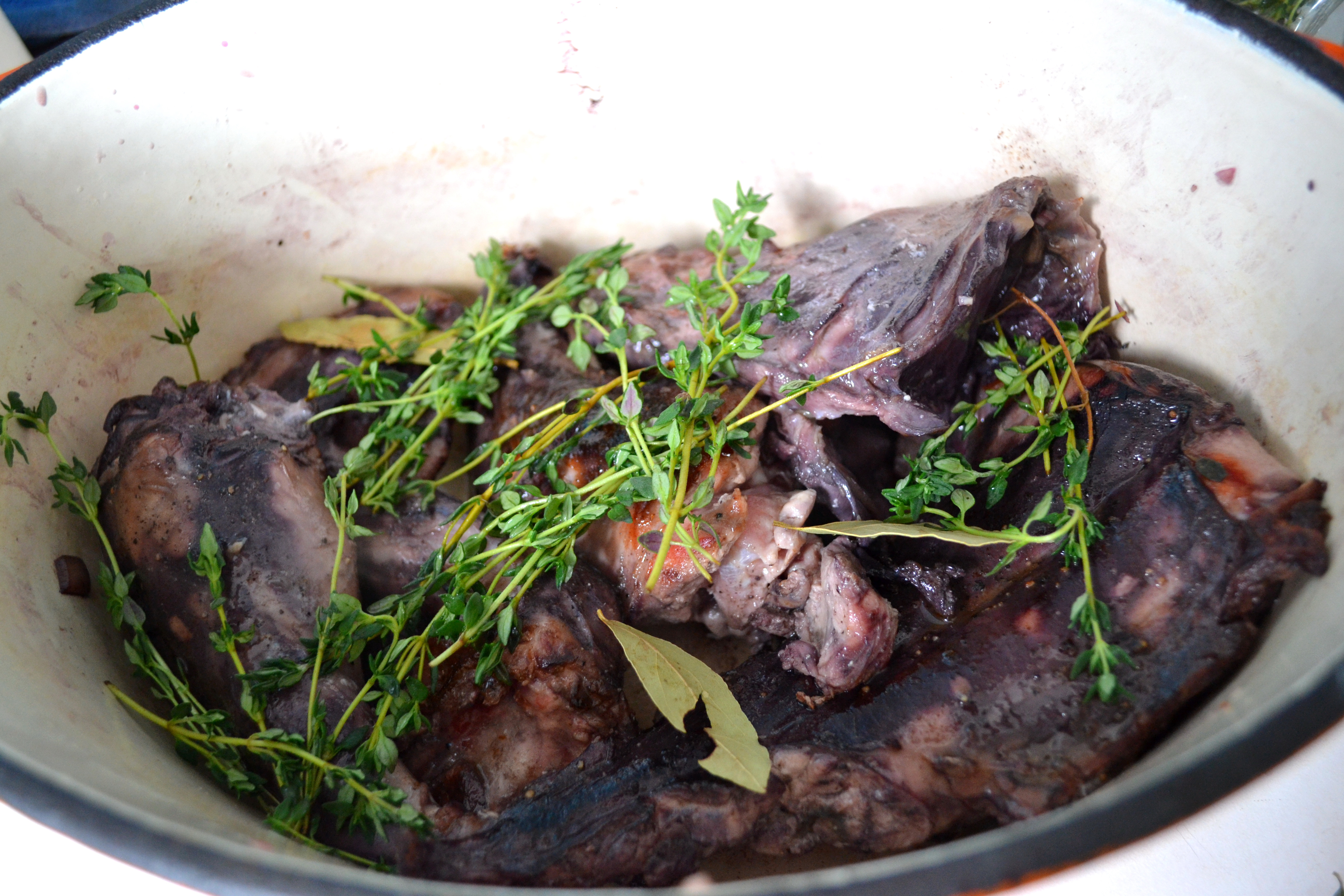 Cover the pot and braise in your oven for about two and a half to three hours, or until the rabbit is completely tender when you poke it with a fork or sharp knife.