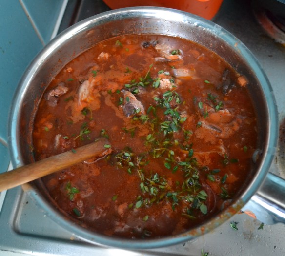 For a long time I didn’t ‘get’ rabbit. “It tastes just like chicken,” people told me. Why not eat chicken, then, I wondered. It was like frog’s legs (which, by the way, taste like chicken only if one imagines one’s chickens cold-blooded and amphibious). I.e., it seemed to me like bourgeois foodie one-upmanship. And there’s the cute factor. When I tweeted about making this ragu, someone replied mournfully that their father had killed their pet rabbit and they never got over it. I too had a pet bunny as a child, and I have cats, and the little rabbit carcasses uncomfortably remind me of my kitties. But if you are a carnivore, wild rabbit is about the most sustainable meat you can eat. Rabbits breed, well, like bunnies (apparently a wild rabbit will have five to six litters a season), unlike most animals we eat they spend their whole lives outdoors, they are killed humanely, and the meat consists entirely of lean white-meat protein. Rabbit beats all or almost all other lean meats for protein to fat ratio. In the UK, you can buy a whole two to three kilo wild rabbit for about £4, which, considering that nearly all of that is usable meat, is extraordinarily good value for those of us trying to cook well on a budget. And rabbit doesn’t really taste like chicken, any more than monkfish tastes like lobster.
