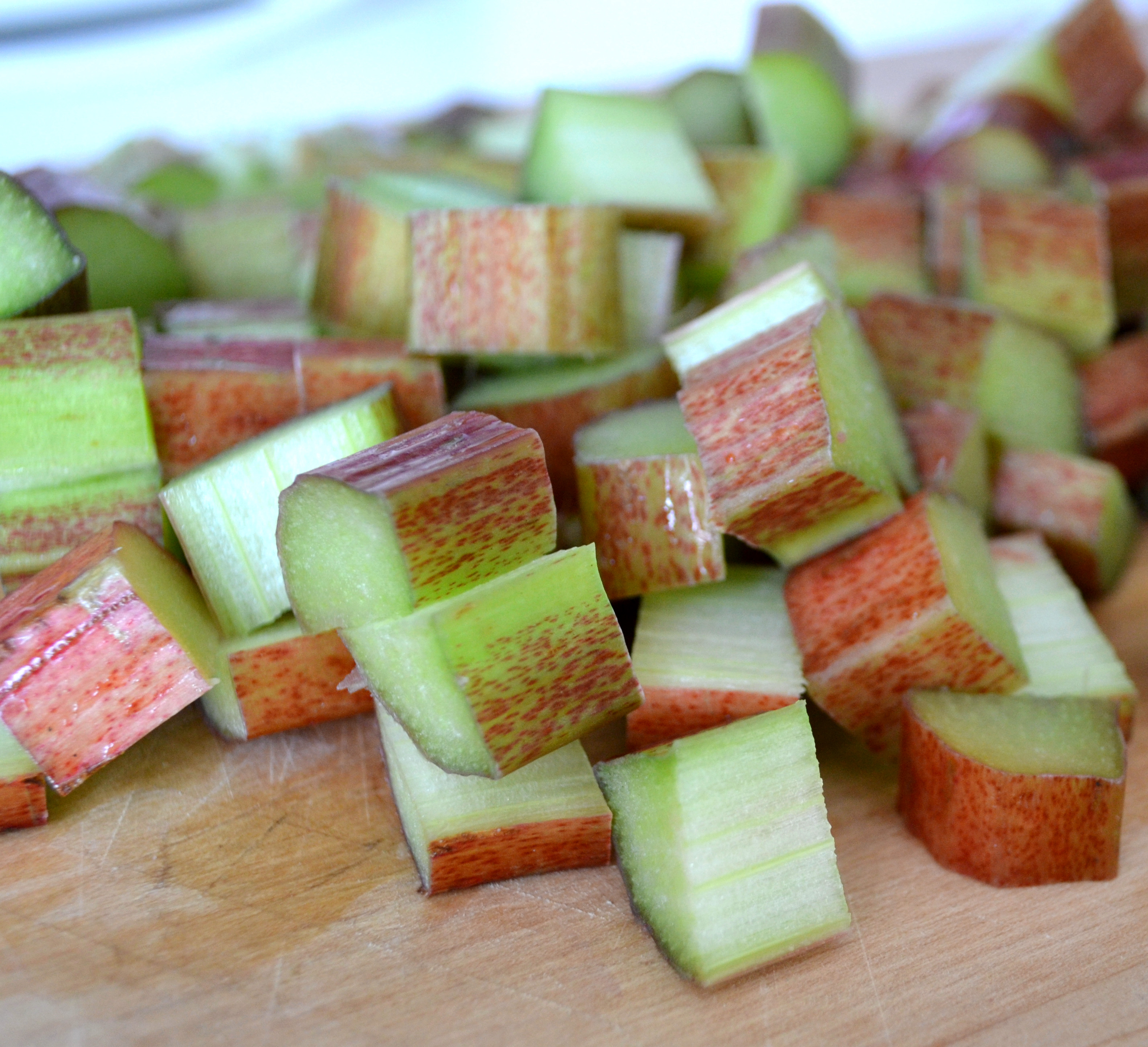 350 grams rhubarb (about 3/4 lb, or four stalks), sliced in half lengthwise and cut into one-centimeter chunks