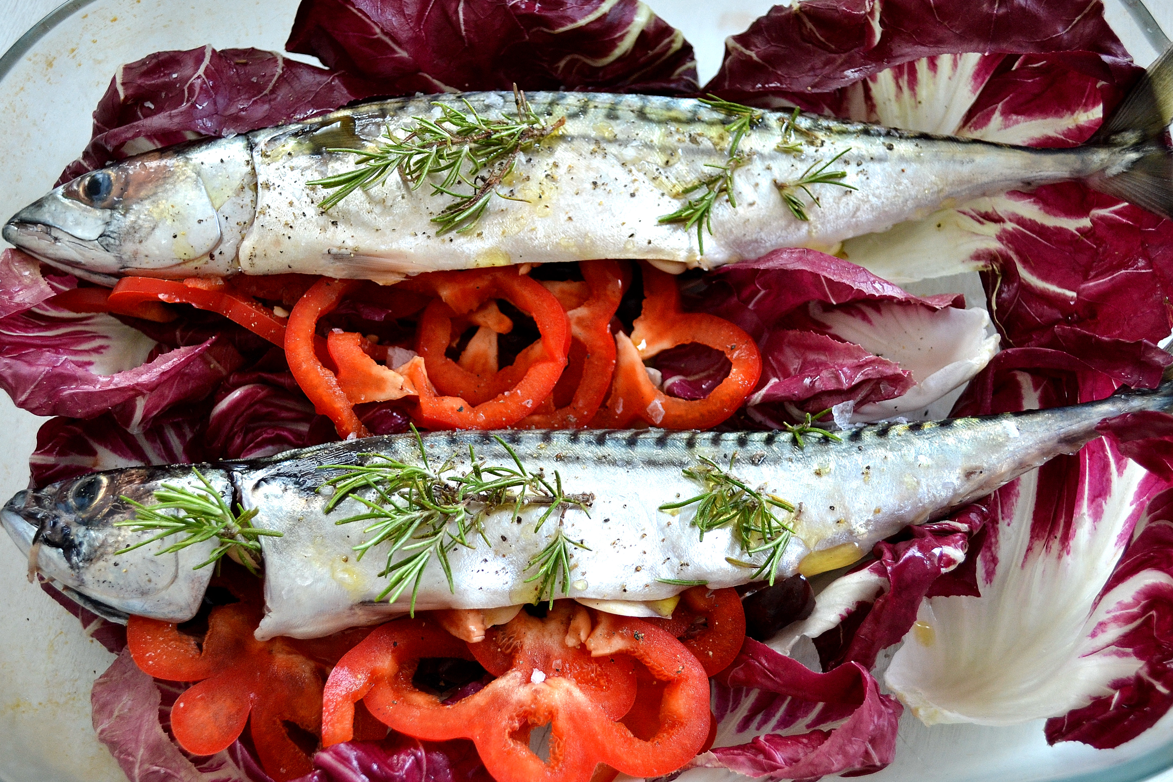 Roasted Mackerel with Radicchio, Black Olives, Red Peppers and Rosemary
