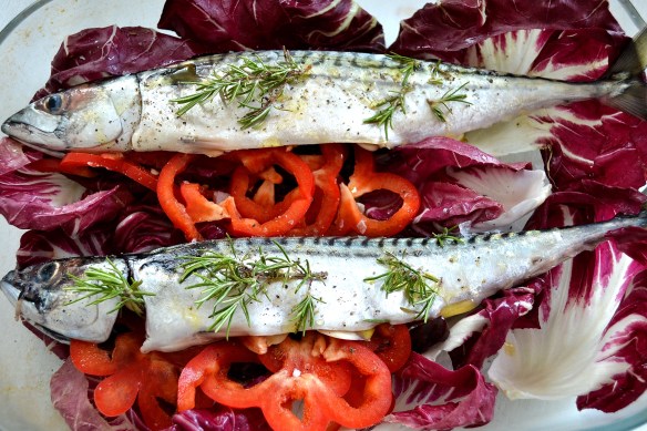 18 thoughts on “Roasted Mackerel with Radicchio, Black Olives, Red Peppers and Rosemary