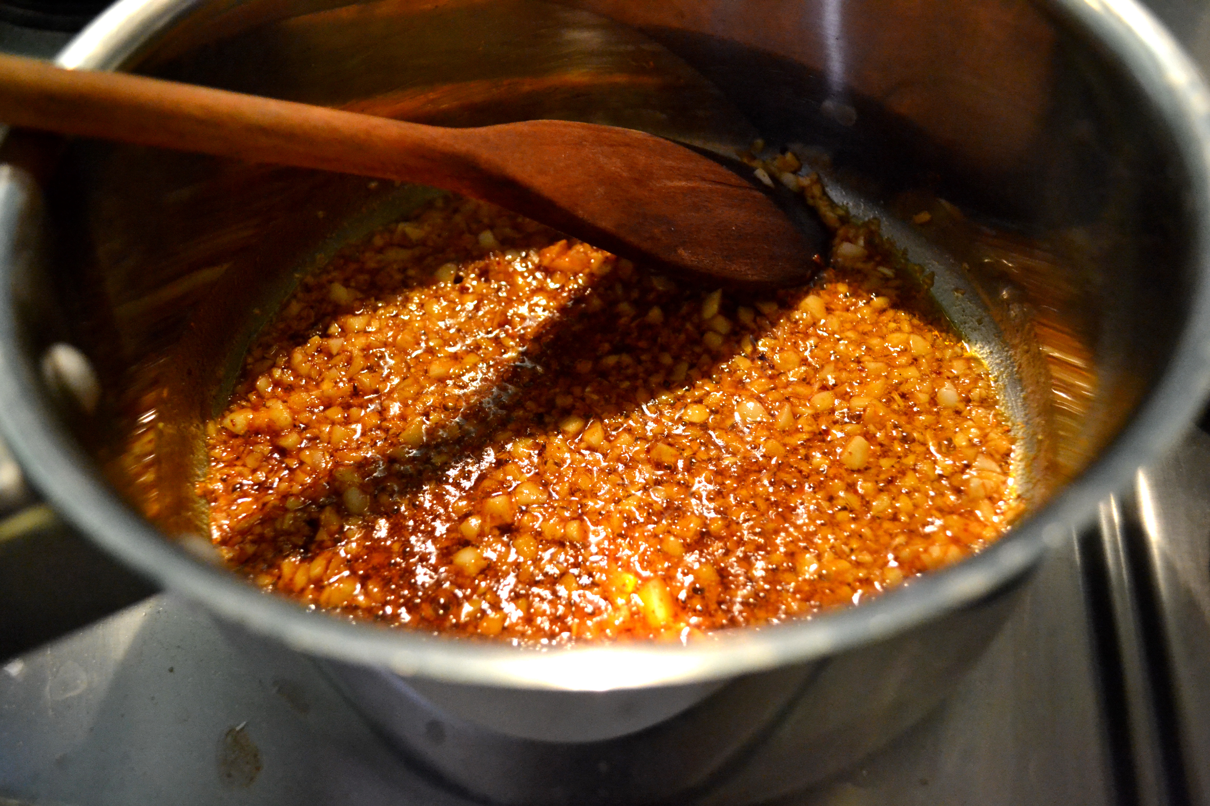 Heat the olive oil in a large, heavy-bottomed saucepan, and stir in the chopped garlic, smoked paprika, and espelette pepper. When the garlic starts to release an aroma, reduce the heat and simmer for 10-15 minutes until the liquid in the pan has turned a rich red and the garlic has become caramelized.