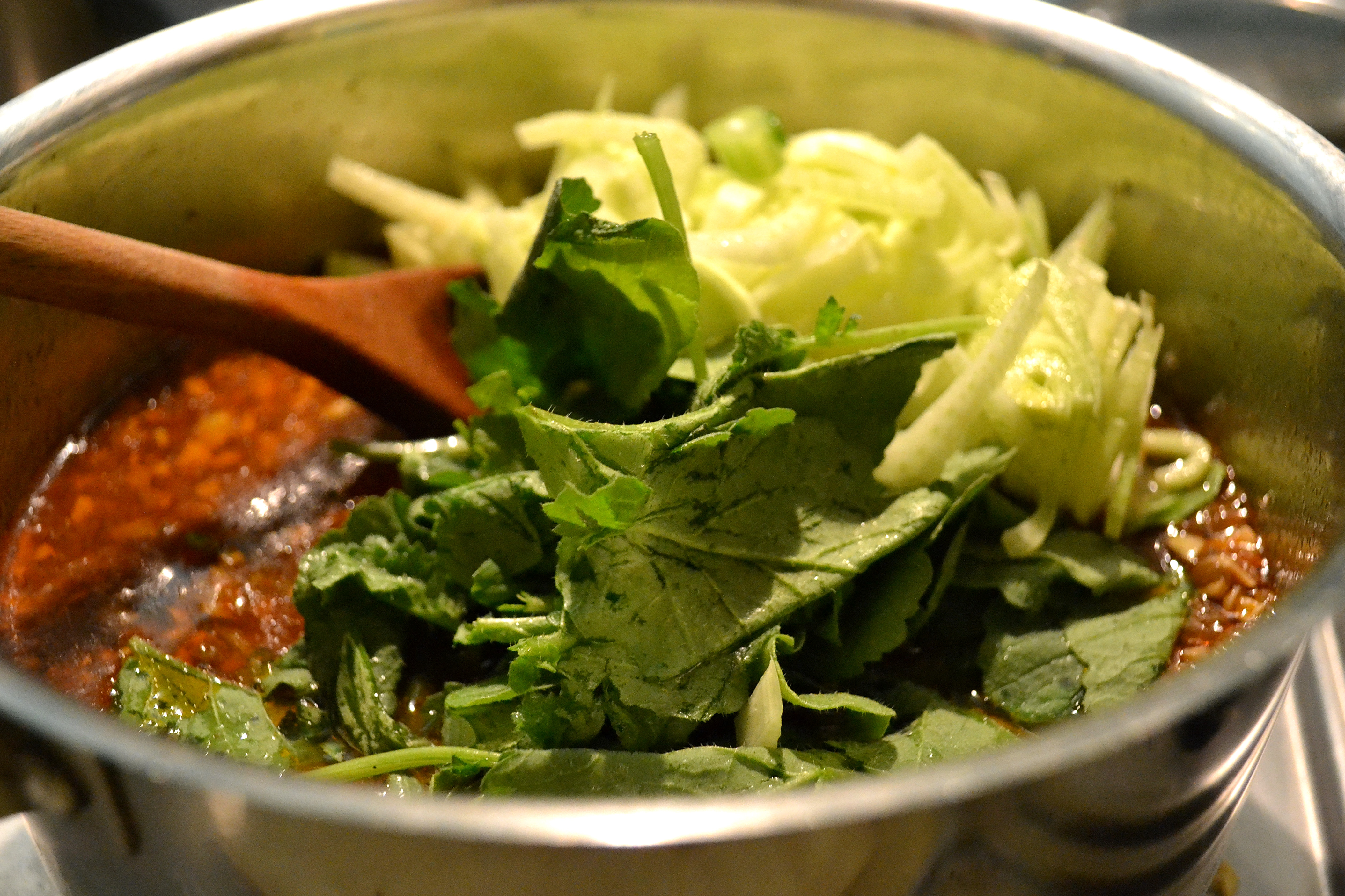 A medium handful of loosely chopped spicy greens, such as radish, mustard, or arugula