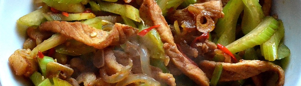 This pork, jellyfish, and celery dish was friend Nayan’s effort to recreate a dish he’d enjoyed at Ying Chow, his favourite restaurant in Adelaide. I largely prepared the dish according to his direction. As with the ma po tofu that we also prepared, I think an excellent vegetarian version could be made substituting a firm Asian mushroom, such as wood ear, for the pork.