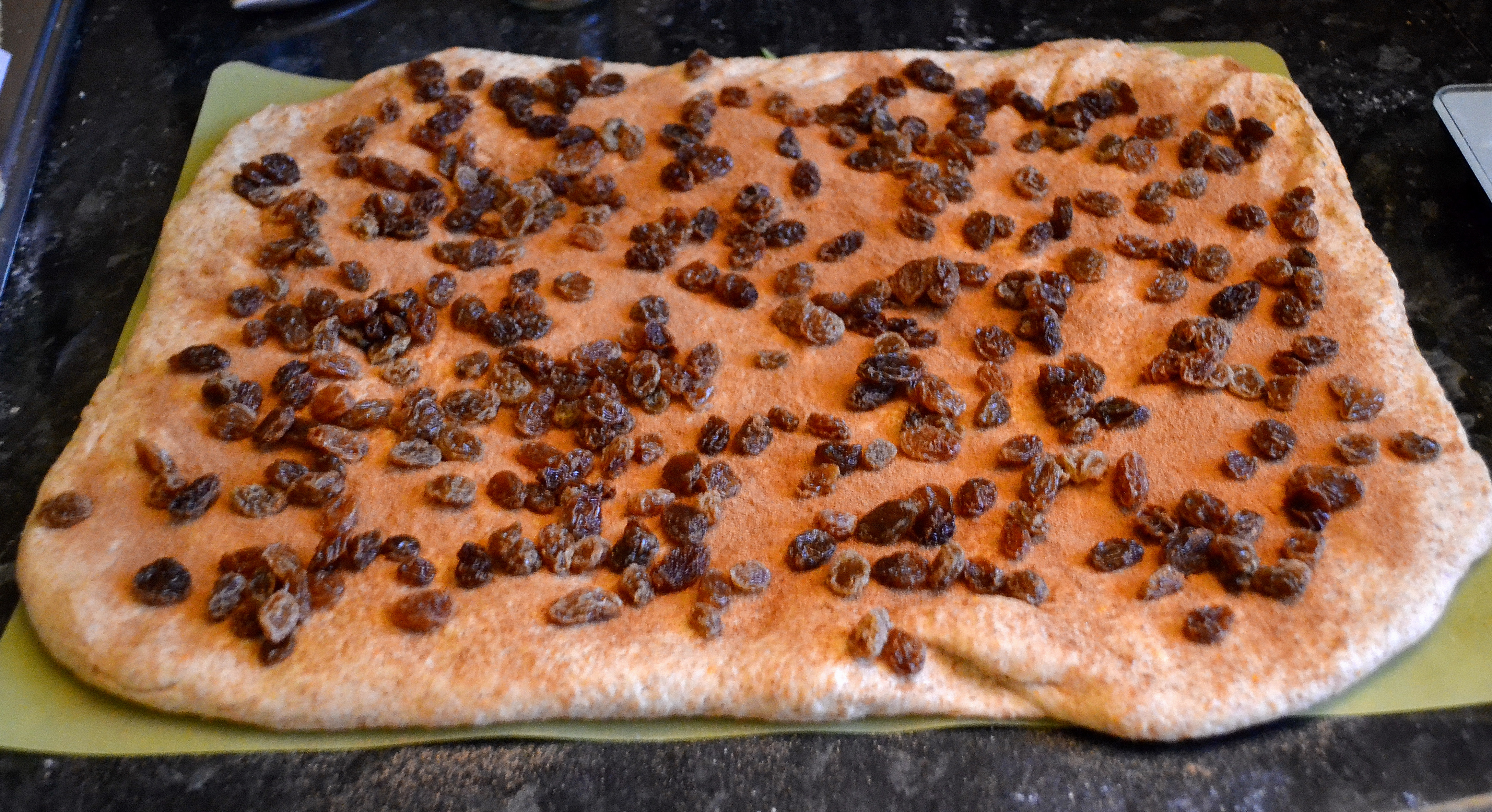Punch it down to deflate it and leave it to double in bulk again. This second rising should be shorter, more like 45 minutes. Now it’s time to shape your loaf. On a non-stick surface or board, press the dough out into a rectangle about ½ inch thick. Sprinkle the dough with an even layer of cinnamon, and then the raisins.