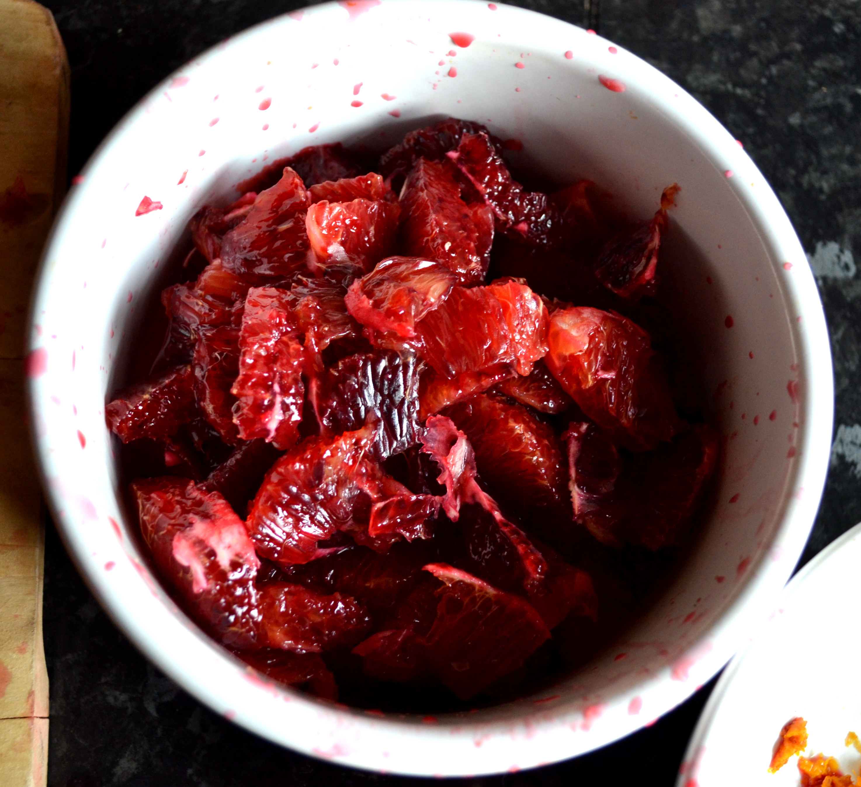 Flesh of five blood oranges, supremed, and any juice reserved (To supreme an orange, using a sharp knife, slice the ends off of either side and then carve away the skin from the flesh, trying to remove all the white pith. Then carefully slice the segments away from the membranes that separate them. I find it is easiest to slice one side of each segment and then you can pull the segment easily away from the membrane on the other side.)