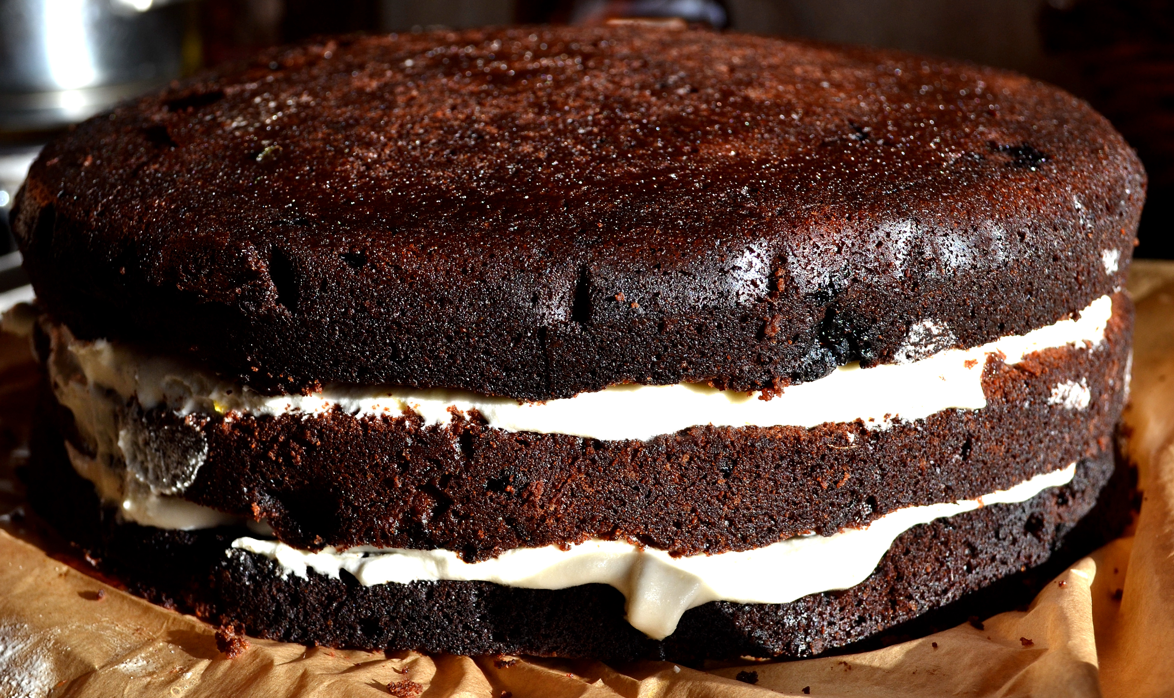 To frost your cake, cut the cake carefully with a bread knife into layers and place onto a board covered with parchment paper. Drizzle each layer with 1-2 tablespoons of Cointreau. Frost generously between the layers using a rubber spatula or palette knife, and then frost the top and sides. If you use the bottom of the cake as your top layer you’ll have a nice smooth surface. Transfer to a clean plate when done.